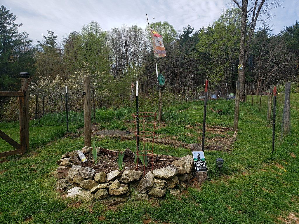 A charming garden area features a circular stone border encircling a small planting bed, with green shoots rising from the soil. Fencing encloses the garden, made of wooden posts and wire, ensuring protection for growing plants. Lush green grass surrounds the area, contributing to a natural look, while trees with fresh leaves provide a vibrant backdrop. Various garden ornaments, including a colorful flag and a wildlife sign, add character. The overall aesthetic exhibits a rustic, countrified feel, combining functionality with a touch of whimsy, ideal for cultivating plants in harmony with nature.