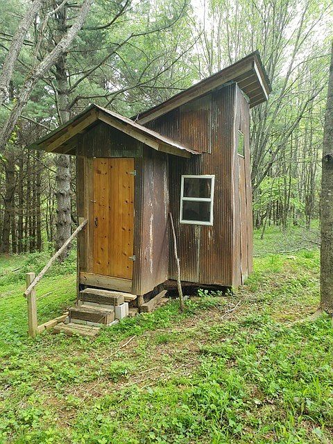 A quaint garden shed stands isolated among lush greenery, featuring a rustic design with corrugated metal siding that shows signs of weathering. The steeply pitched roof adds character, contrasting with the warm-toned wooden door, which has simple, sturdy hardware. A small window beside the door allows natural light to filter in, framing the enclosure within a serene forest backdrop. Wooden steps lead up to the entry, enhancing accessibility. The surroundings are vibrant with fresh grass and scattered trees that create a tranquil atmosphere, making this structure an ideal retreat for tools or hobbies, blending functionality with nature.