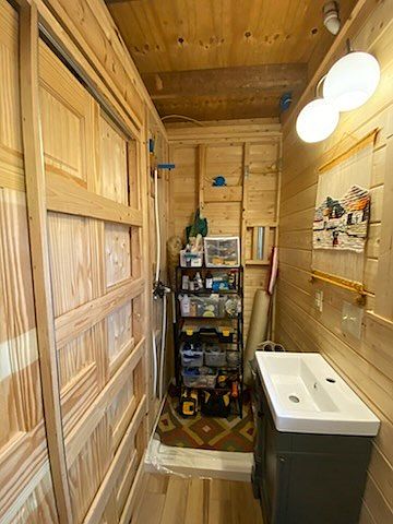 A narrow laundry room featuring wooden walls and ceiling, creating a warm, rustic ambiance. The space showcases a gray utility sink contrasted against lighter wood tones. To one side, a compact shelving unit holds various tools and supplies, maintaining an organized feel. A textured area rug introduces a splash of color and pattern, enhancing visual interest. Two round light fixtures above provide ample lighting, illuminating the room while emphasizing its simplicity. The combination of natural materials and practical elements reflects both functionality and understated charm in this cozy utility area.
