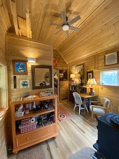 This space showcases a cozy cabin interior characterized by warm wood paneling that envelops the walls and ceiling, creating an inviting atmosphere. A ceiling fan circulates air, complementing the natural light filtering through large windows. On one side, a wooden dining table is paired with simple chairs, while a home office area with a small desk sits across from it. A compact television is positioned on a low stand, surrounded by decorative elements. A bookshelf overflowing with books stands prominently, adding a personal touch. The overall color palette combines natural hues of wood with earthy tones, enhancing the warm, rustic feel.