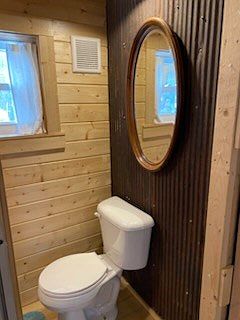 This bathroom corner features an interesting blend of rustic and modern design elements. The wall to the left is adorned with warm, natural wooden planks, creating a cozy ambiance. In contrast, the opposing wall showcases dark corrugated metal, adding an industrial touch. A circular wooden-framed mirror hangs above a white toilet, complementing the organic tones of the wood. Natural light filters in through a small window, casting soft shadows and enhancing the inviting atmosphere. The flooring is streamlined with wooden planks, establishing continuity throughout the space while emphasizing simplicity and functionality in design.