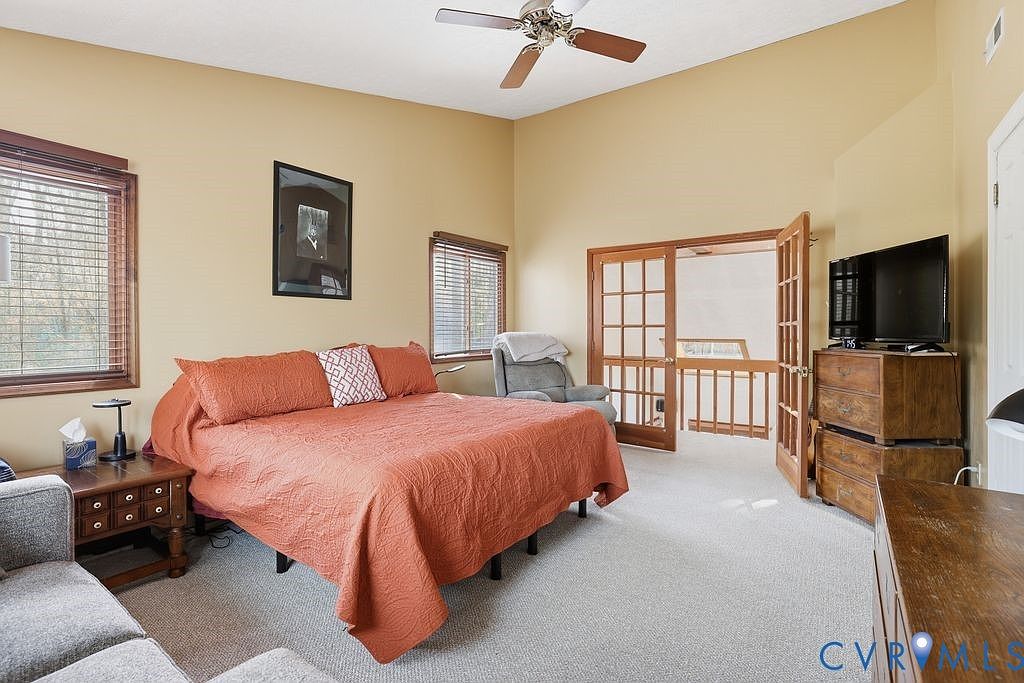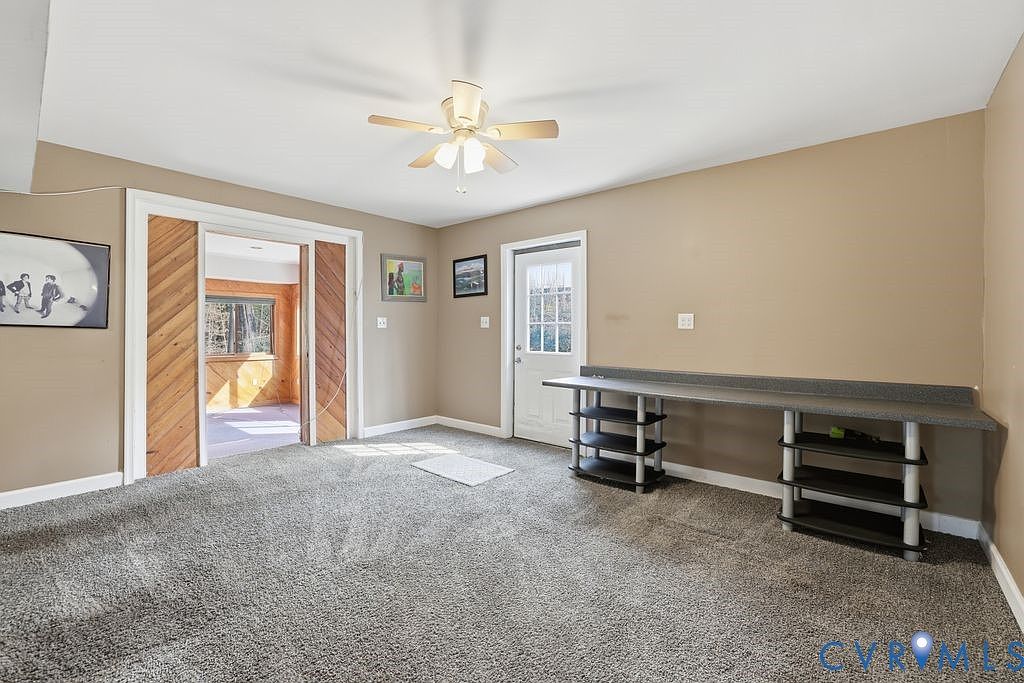 This sunroom features warm beige walls that create a cozy atmosphere, complemented by a plush gray carpet underfoot. The space has a ceiling fan with light fixtures, enhancing air circulation and brightness. Two strategically placed sliding doors framed in white open to the outside, allowing natural light to flood in. A simple black shelving unit runs along one wall, providing storage or display options. Nearby, framed artworks add a personal touch. The room is designed for relaxation, with an inviting appearance that encourages soft light and views of the outdoors, making it a perfect retreat.