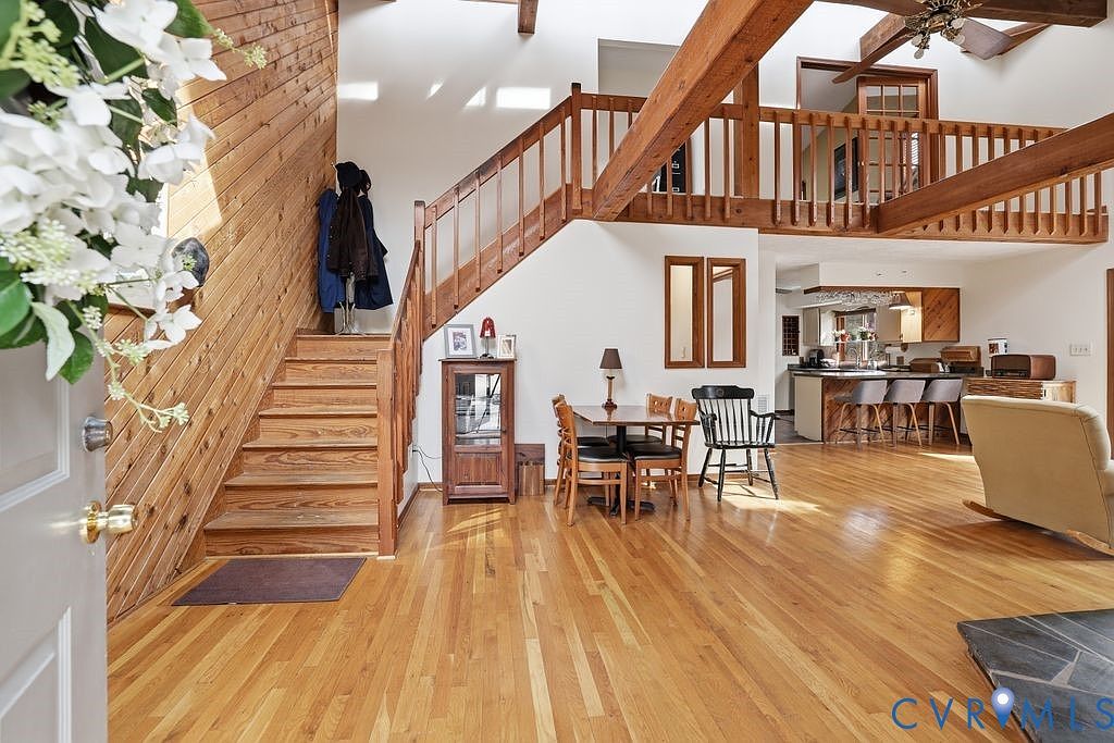 An inviting entryway showcasing polished hardwood floors that extend throughout the space. The warm tones of the wood complement earthy walls, and vertical wooden paneling adds texture. A staircase with sturdy wooden steps ascends to a lofted area, flanked by a simple railing. To one side, a circular dining table, adorned with four wooden chairs, creates a cozy dining nook. A glass display cabinet adds charm, reflecting light from the nearby kitchen. Decorative white flowers in a vase frame the wooden door, enhancing the homey atmosphere. Overall, the design merges rustic elements with modern functionality.