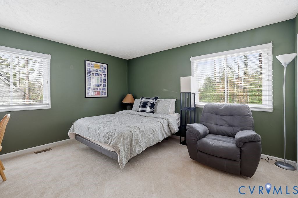 A cozy bedroom featuring deep green walls that provide a calming atmosphere. Natural light pours in through two window units dressed with white blinds, illuminating the room. A neatly made bed sits against one wall, adorned with a light gray comforter and decorative pillows. Adjacent to the bed is a contemporary floor lamp and a comfortable charcoal recliner, creating a perfect reading nook. In the corner, a framed collage of photos adds a personal touch. The carpeted floor contributes warmth, while the overall layout promotes a sense of tranquility and relaxation, making it an inviting retreat.
