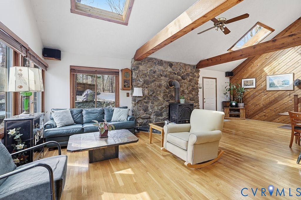 A spacious living room with a cozy, open layout, featuring a blend of rustic elements and modern design. Polished hardwood floors reflect natural light pouring in through large windows, accentuating the warm wood tones of the exposed beams overhead. A stylish wood stove nestled in the corner adds warmth and character, while a mix of seating options, including a comfortable armchair and a four-seater dining table, creates a functional space for relaxation and socializing. Neutral walls complement the rich woods, and decorative items on the shelves and table provide personalized touches to the inviting atmosphere.