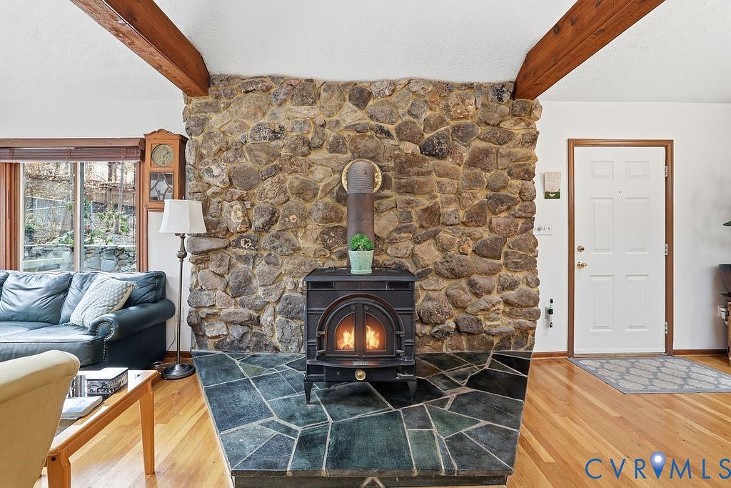 This living room features a stunning stone accent wall, composed of irregularly shaped stones that add rustic charm. A classic wood stove sits on a dark, geometrically patterned slate hearth, providing both warmth and a focal point. Light streams in through large, multi-paned windows adorned with wooden blinds, illuminating a comfortable blue leather sofa with decorative pillows. To the left, a side table holds a modern lamp, accentuating the room’s cozy atmosphere. The hardwood flooring, complemented by a subtle area rug, adds elegance. A warm color palette and exposed wooden beams enhance the inviting ambiance.
