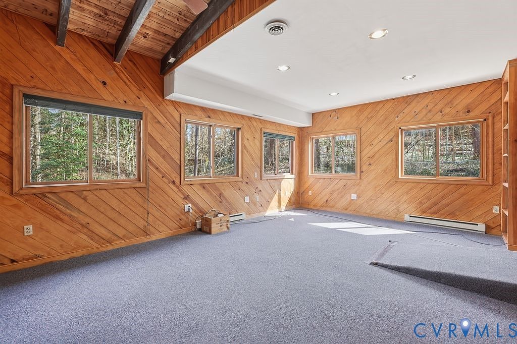 This sunroom features rich wooden paneling with a diagonal pattern, creating a cozy, rustic aesthetic. Large windows on three sides invite natural light and offer views of the surrounding forest. The ceiling is lined with exposed wooden beams, enhancing the room’s charm. A plush, neutral-toned carpet covers the floor, providing comfort while complementing the warm wood tones. Recessed lighting fixtures illuminate the space, maintaining a bright yet inviting atmosphere. An air vent is strategically placed for heating, while a corner has a small shelf for added storage, showcasing thoughtful design that marries functionality with visual appeal.