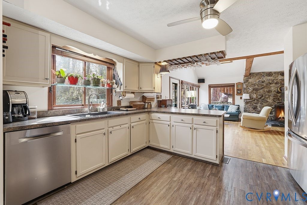 This kitchen features a blend of modern and rustic aesthetics, highlighted by light beige cabinetry and dark granite countertops. The layout promotes functionality, with a double sink positioned under a large window that invites natural light and showcases vibrant potted plants. Stainless steel appliances add a sleek touch. Exposed wooden beams and a hanging light fixture contribute warmth and character, while a textured area rug softly complements the hardwood floor. The open design seamlessly connects to the adjacent living area, creating an inviting atmosphere for both cooking and socializing.