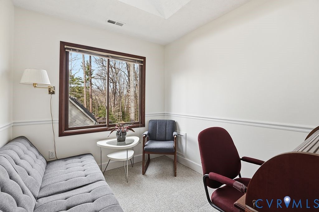 This small home office features a minimalist design with an inviting layout. A plush gray sofa, characterized by its tufted upholstery, complements a simple round white side table, providing a cozy seating area. Occupying one corner is a sleek blue chair, elegantly contrasting with the burgundy desk chair positioned nearby. The walls are painted a soft white, accented by decorative molding, enhancing the room’s spacious feel. A large window allows natural light to flood in, showcasing a serene view of trees outside, which adds a touch of nature to the tranquil workspace. Light carpeting completes the warm ambiance.