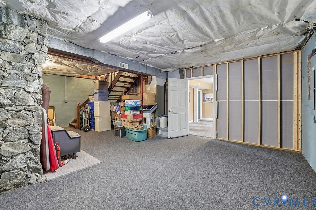 This unfinished basement features a rustic stone wall, adding an earthy texture against the otherwise plain, painted blue walls. The ceiling is covered with insulation, providing a utilitarian look. A staircase leads to the upper level, framed by neatly arranged boxes, indicating a storage area. The floor is carpeted in a muted gray, enhancing the cozy but unfinished feel. Towards the back, an open doorway reveals a glimpse of the carpeted living space above, contrasting the stark basement. The overall aesthetic leans towards functional rather than decorative, showcasing the space’s potential for organization.