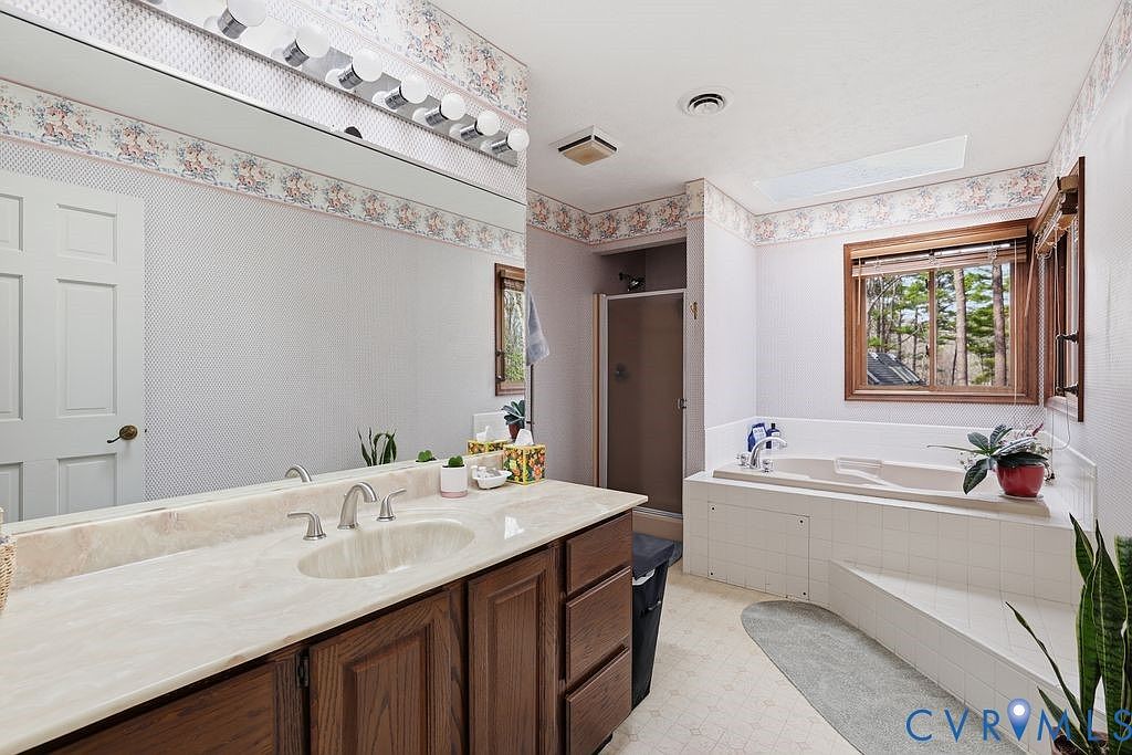 The bathroom features a spacious layout with a combination of warm wood tones and soft pastel colors. The dual sink vanity boasts a creamy marble countertop, complemented by rich oak cabinetry. Above, a row of round vanity lights illuminates the space, while floral wallpaper crowns the walls, adding vintage charm. A large window, framed in warm wood, offers natural light and a view of greenery outside. A separate shower cubicle is positioned discreetly, along with a deep soaking tub that sits against a wall. Potted plants bring a touch of freshness, enhancing the tranquil atmosphere.