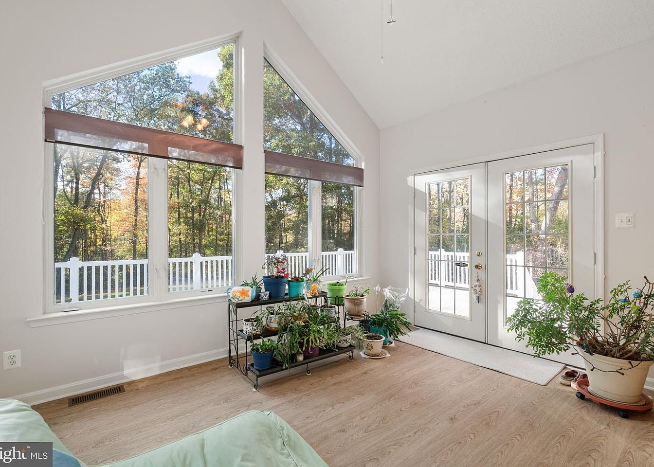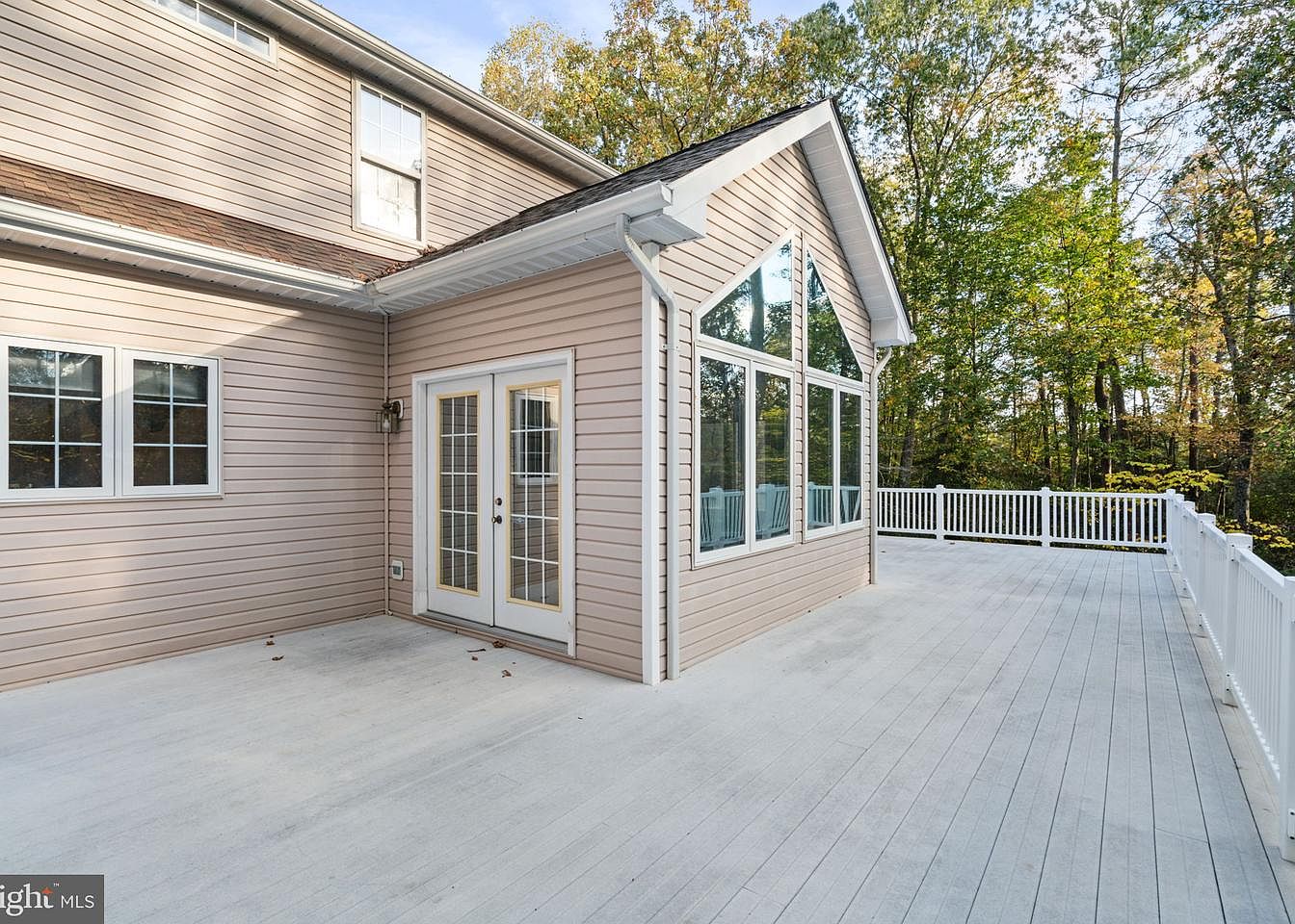 This view highlights a charming sunroom entrance of a historic American home, featuring a blend of modern and classic aesthetics. The exterior showcases light beige vinyl siding, complemented by large, angular windows that invite natural light. A pair of elegant French doors with glass panes offer an inviting entry, framed by subtle lighting fixtures. The spacious, white deck extends outward, bordered by a white railing that enhances the area’s openness and connection to nature. Lush greenery is visible in the background, providing a tranquil atmosphere. The combination of architectural details and serene surroundings create a harmonious outdoor retreat.