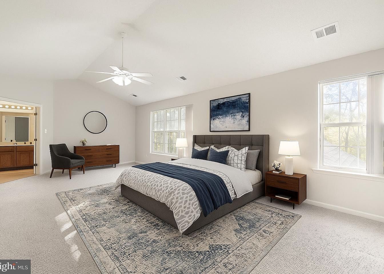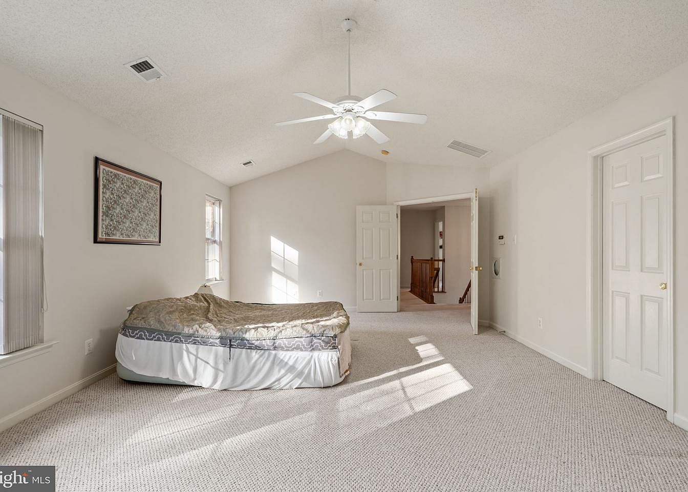This spacious bedroom features a high, vaulted ceiling that enhances its open feel. Soft, neutral walls complement the plush, light beige carpeting, providing a serene atmosphere. A large bed, partially covered with a textured blanket, occupies one corner, creating a cozy focal point. Natural light pours in through two windows, casting gentle shadows on the floor. A decorative framed artwork adds an element of interest above the bed. Two doors lead to adjacent areas, one opening towards a staircase, and the other offers access to additional rooms. A ceiling fan with light adds functionality and comfort.