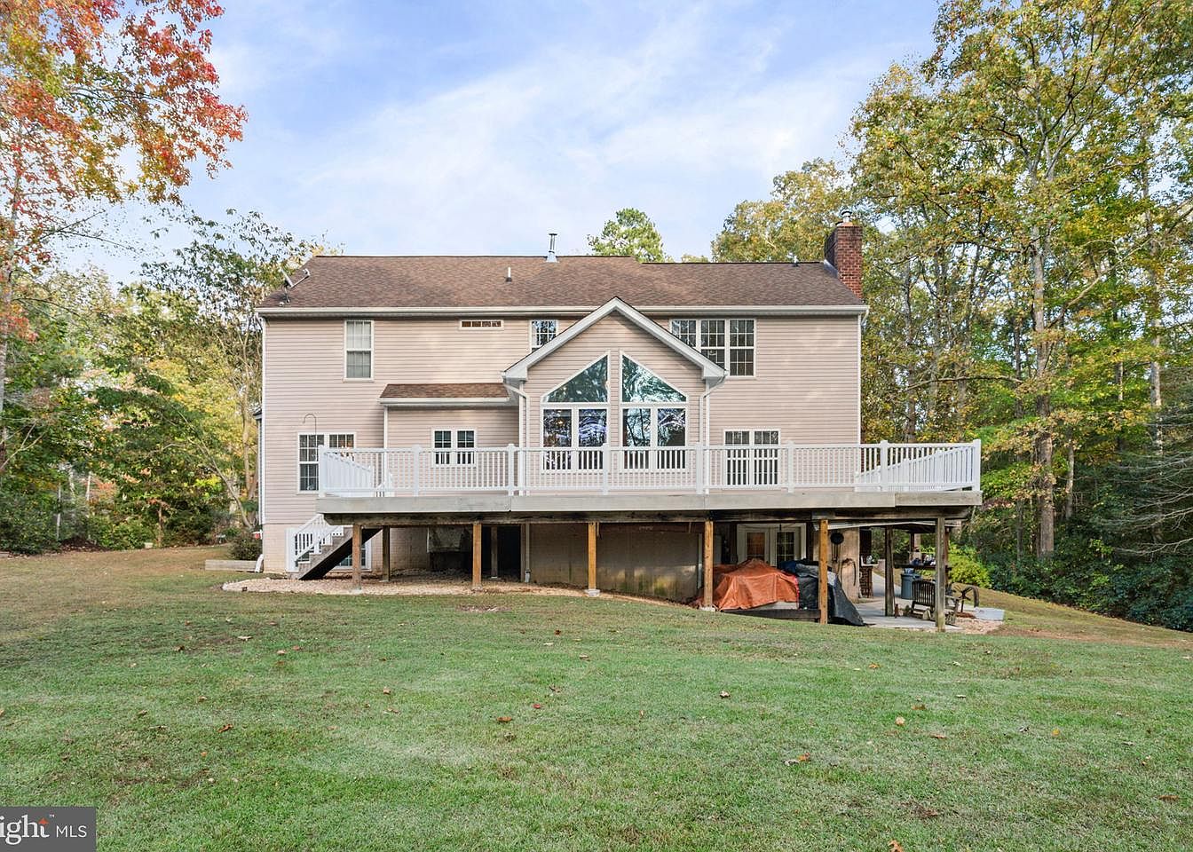 The exterior of the house features a large, elevated deck supported by wooden posts, creating an inviting outdoor space. A mix of soft beige siding complements the warm tones of the brown roof. The expansive deck is lined with white railings, providing a classic and airy feel. Large windows enhance the home’s façade, allowing plenty of natural light to flood the interior. The back lawn is lush and well-manicured, framed by a backdrop of mature trees displaying autumn foliage. Below the deck, practical storage is visible, hinting at functional outdoor living. This space blends nature with modern home design.