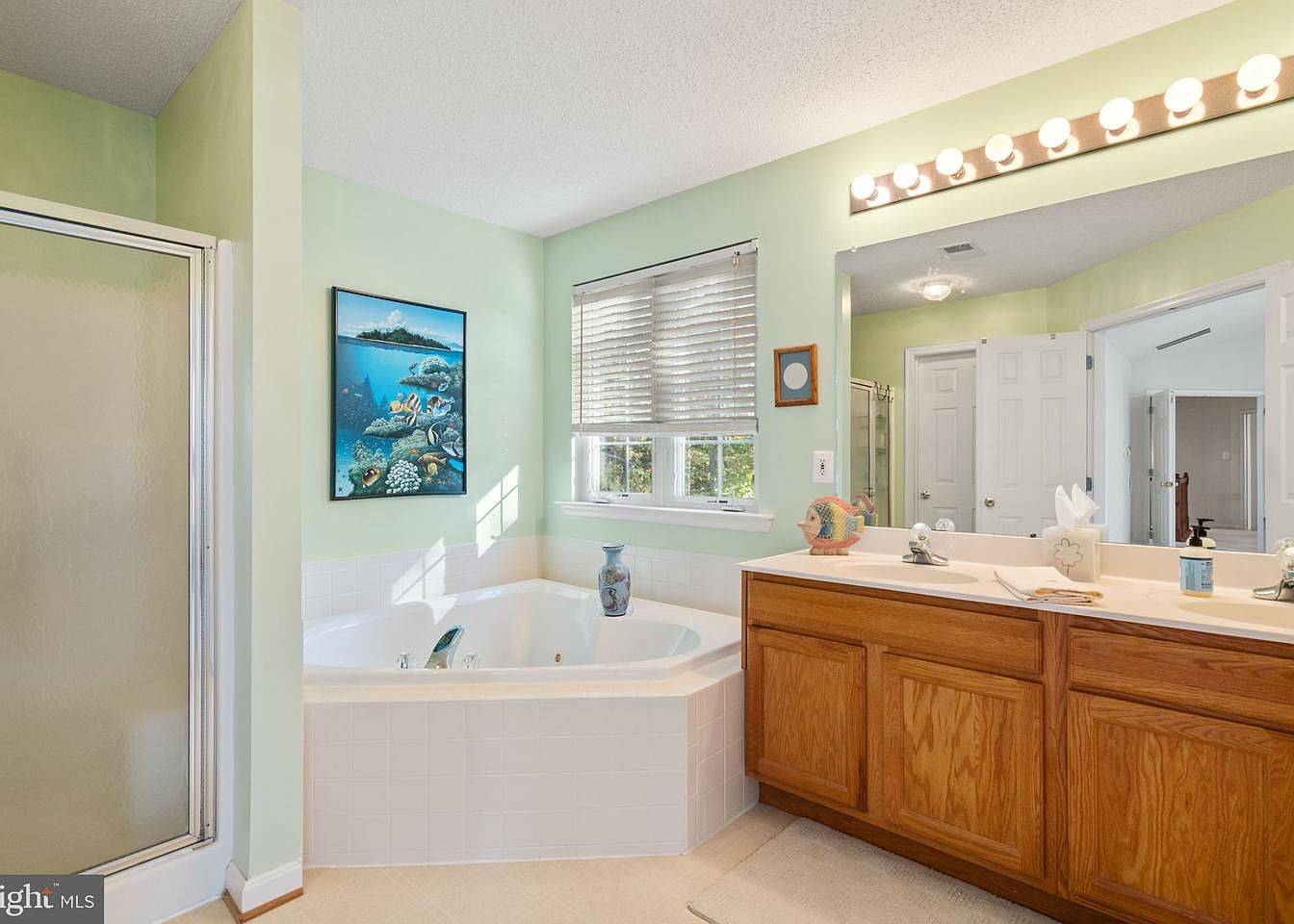 This bathroom features a calming light green color scheme, creating a refreshing ambiance. A spacious jetted tub is positioned in one corner, surrounded by white tile. The natural light filters in through a window adorned with wooden blinds, illuminating a colorful sea-themed painting above the tub. An oak vanity with dual sinks provides ample storage and counter space. A shower stall with frosted glass complements the modern fixtures. The floor is tiled in neutral tones, enhancing the airy feel. Decorative accents, including a ceramic fish and subtle wall art, add personal touches to this inviting space.