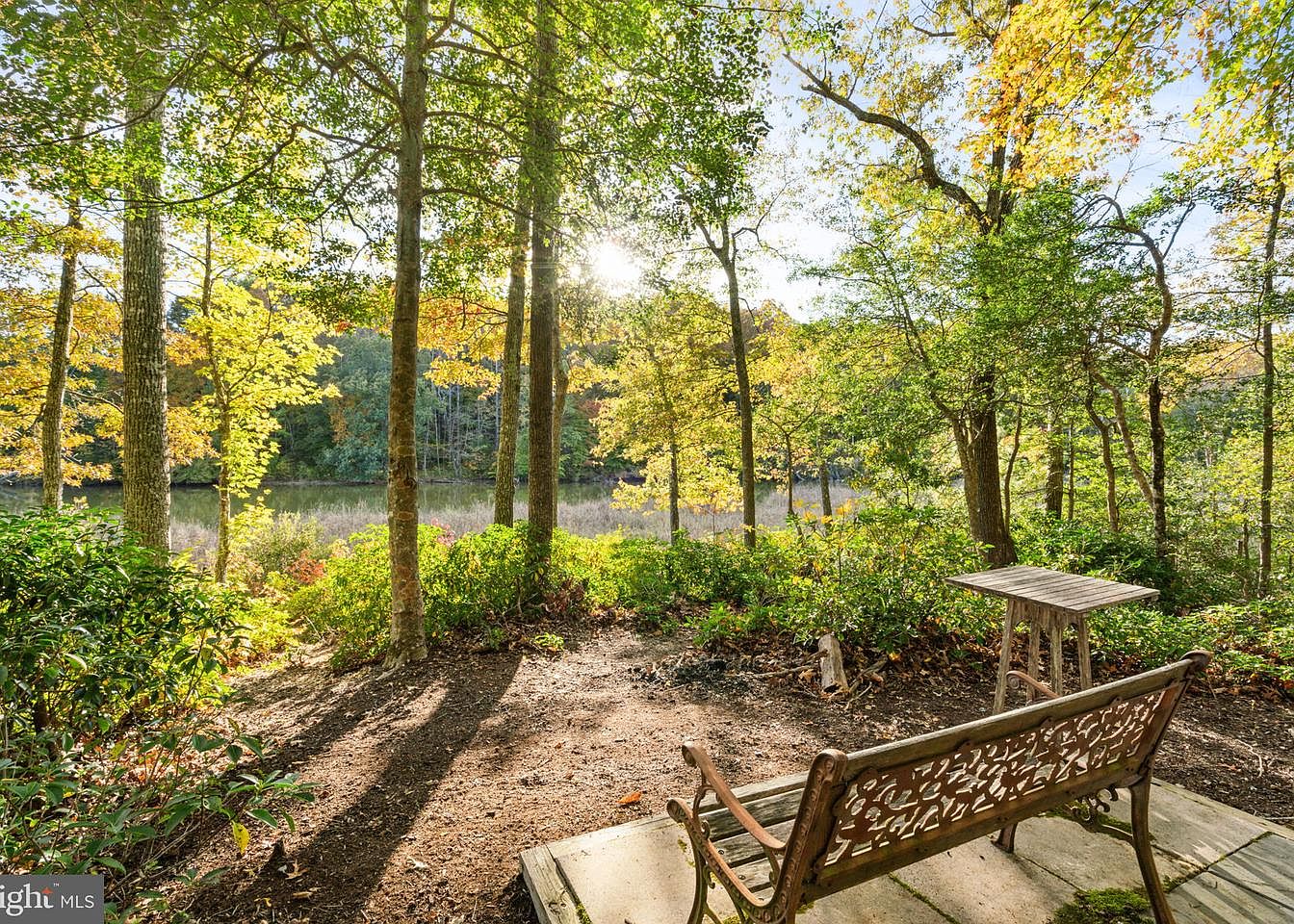 Nestled among vibrant trees, this garden area features a rustic wooden table and a decorative metal bench. The bench, intricately designed, offers a cozy seating option to appreciate the serene outdoor view. Surrounding greenery includes lush shrubs and colorful autumn leaves, creating a picturesque backdrop. Sunlight streams through the branches, illuminating the space with a warm glow. The ground is covered with rich earth tones, enhancing the natural ambiance. A peaceful river glimmers in the distance, blending harmoniously with the natural landscape, inviting moments of relaxation and quiet reflection in this charming outdoor retreat.