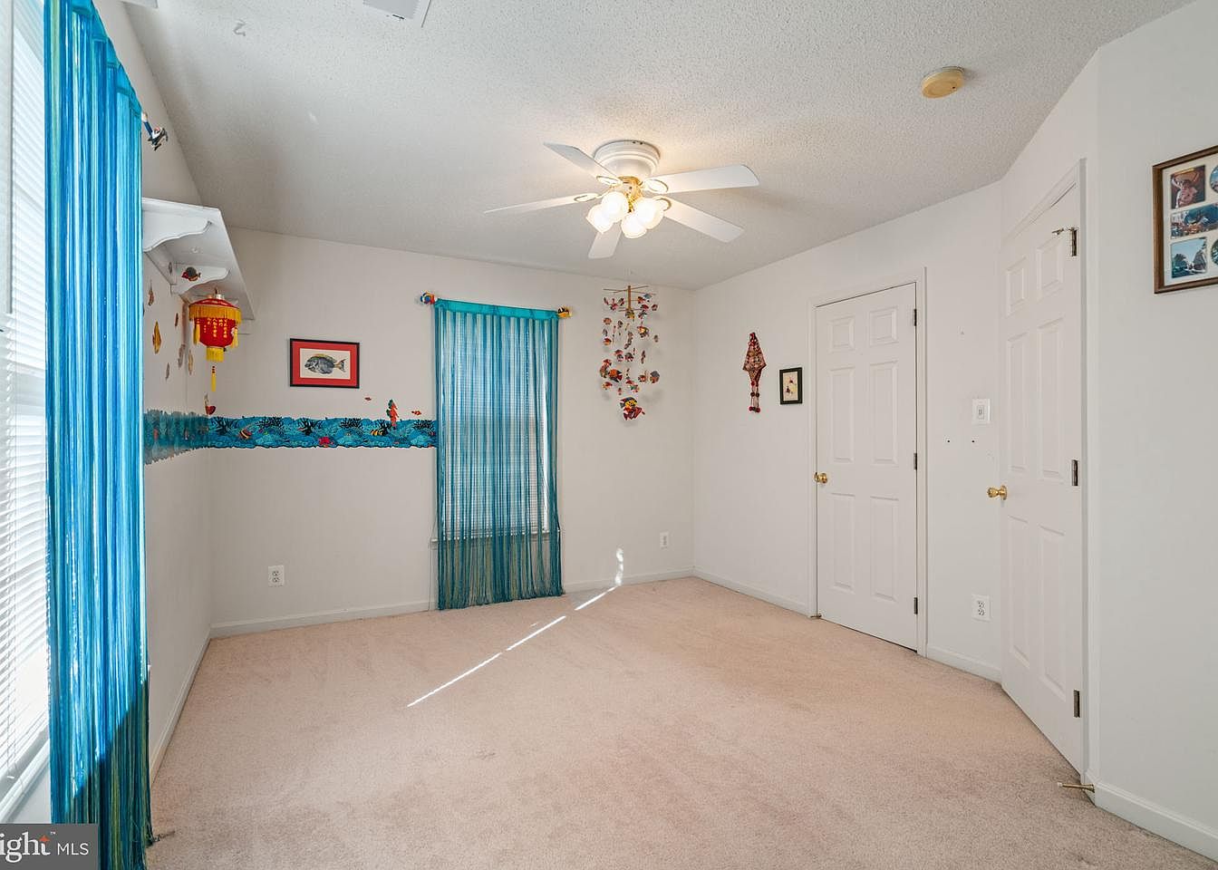 A cozy bedroom with soft, beige carpeting extending throughout. Walls are painted light gray, enhancing the warm ambiance. Window treatments feature vibrant turquoise sheer curtains, allowing soft natural light to filter in. A decorative wall border showcases a playful aquatic theme with colorful fish and waves, adding a whimsical touch. A ceiling fan with elegant white blades provides both style and airflow. Accents include a red lantern, framed fish artwork, and small hangings that bring a hint of cultural charm. The space features two white doors for closet access, contributing to a clean, uncluttered look.