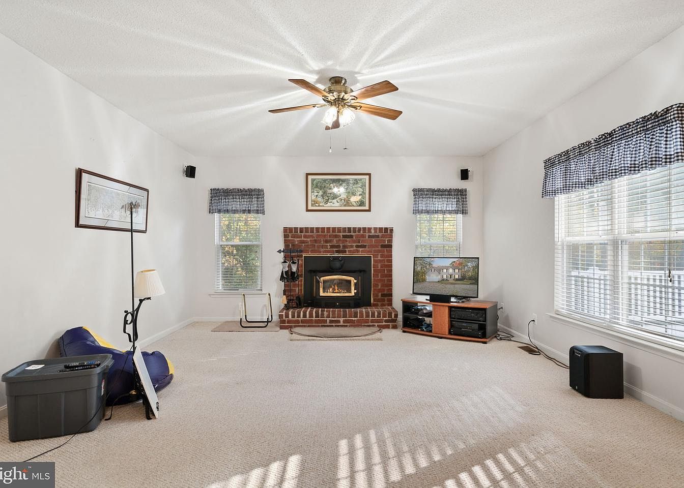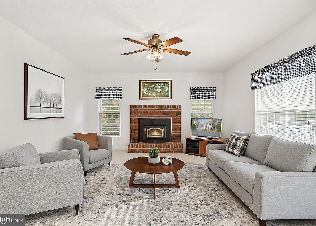 This spacious living room features a cozy brick fireplace with a wood-burning stove, serving as a focal point. Two large windows adorned with checked valances allow natural light to fill the room. The walls are painted in a soft white, creating an airy atmosphere. A light beige carpet adds warmth and comfort underfoot. Minimalist furniture includes a flat-screen television on a wooden stand and a recording of a chair in the corner. An elegant ceiling fan with wooden blades enhances ventilation. A framed artwork above the fireplace adds a touch of sophistication to this inviting space.
