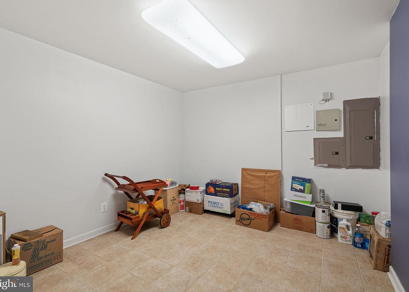 This storage room features a minimalist design with plain white walls and a tile floor, contributing to a clean, understated aesthetic. It has ample space for storing various items, with cardboard boxes stacked against the walls containing miscellaneous goods. A wooden cart with wheels is positioned prominently, suggesting practical utility. The ceiling is brightened by a rectangular light fixture that illuminates the room evenly. Electrical panels are visible on one wall, hinting at functionality beyond storage. The overall feel is practical and functional, ideal for organizing household items in a compact space.