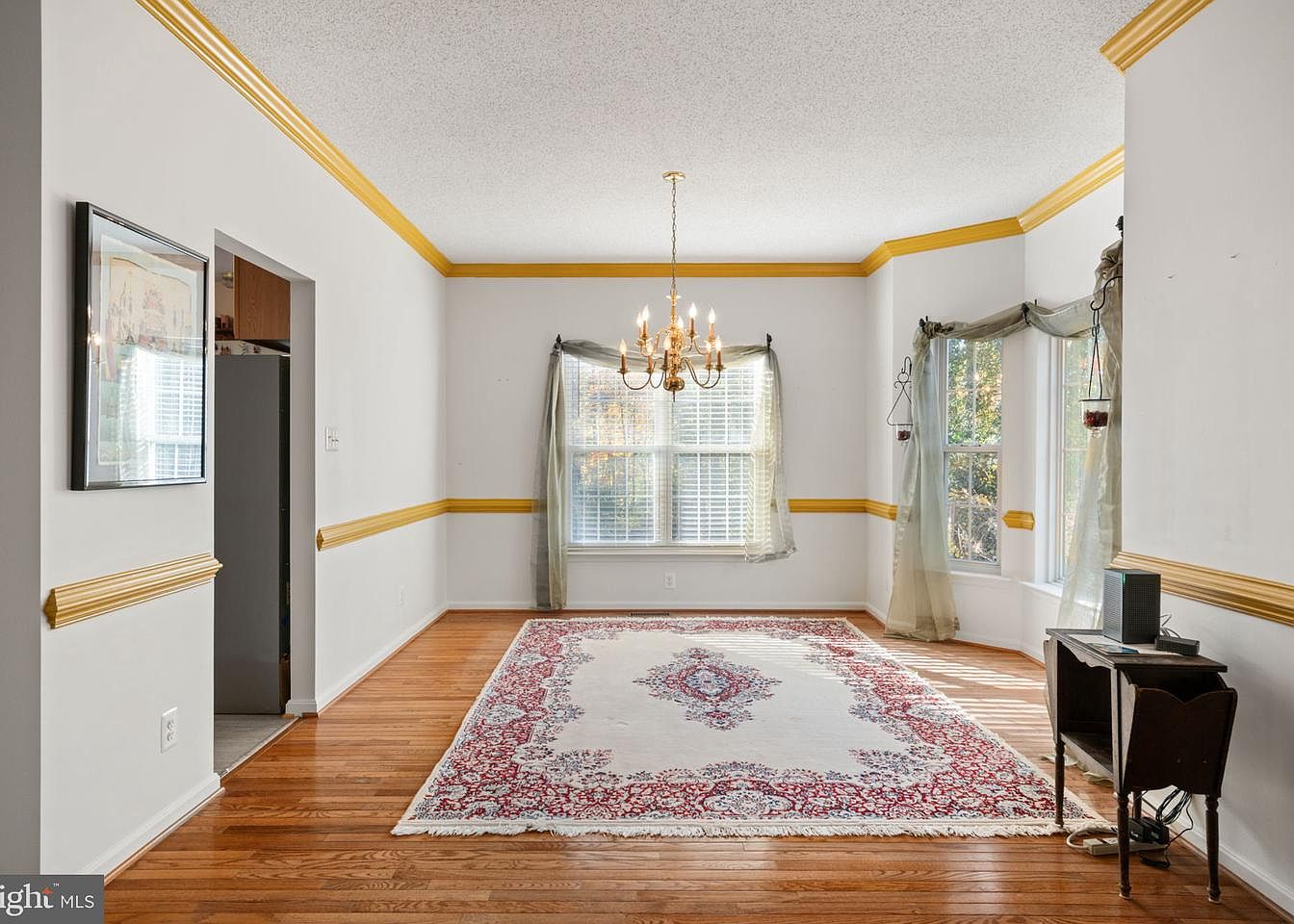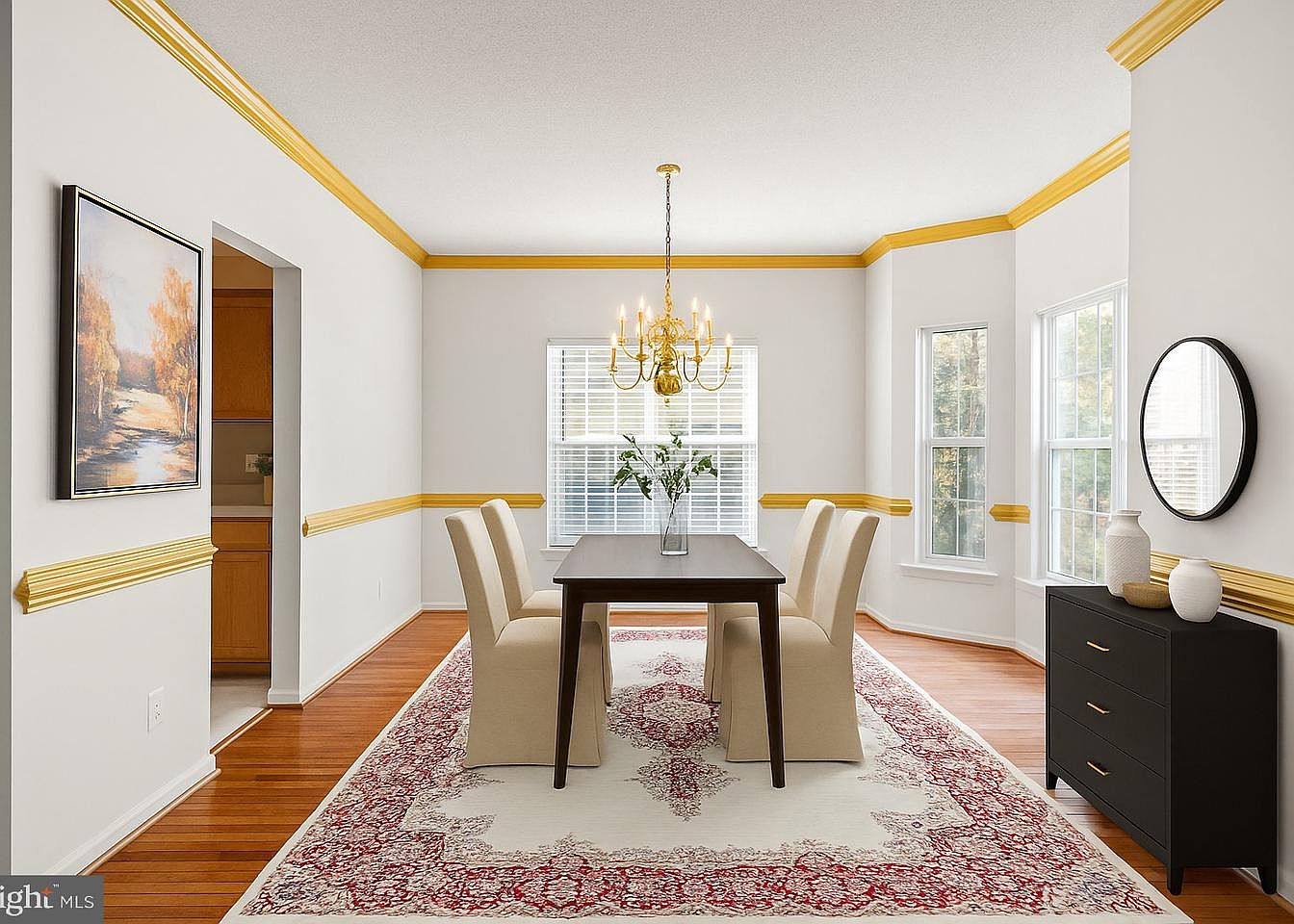 This dining room features a harmonious blend of design elements, showcasing soft hues and inviting textures. A vivid red and cream area rug anchors the space, complementing the warm, honey-toned hardwood flooring. The walls are adorned with a clean white finish, contrasted by elegant yellow crown molding that adds a touch of sophistication. Large windows, framed by sheer drapes, allow natural light to flood in, creating a bright and airy atmosphere. A classic chandelier hangs gracefully from the ceiling, illuminating the room evenly. A small, dark wood side table enhances the room’s character, offering a practical space.