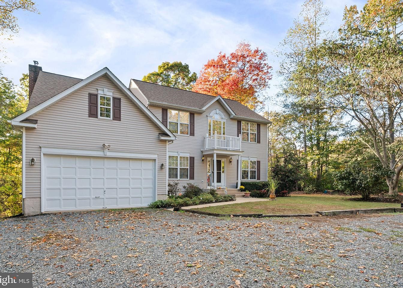 The front facade features a blend of traditional and modern elements, highlighted by light beige vinyl siding. Large, symmetrical windows with dark shutters create a balanced appearance. A centered porch adorned with decorative railings invites entry, while the gabled roof adds charm. The gravel driveway leads to a spacious garage, enhancing accessibility. Surrounding the house, manicured lawns display autumn foliage, showcasing vibrant yellows and reds from nearby trees. A mix of shrubbery and decorative plants adds color and texture, merging the home seamlessly with nature, and evoking a welcoming atmosphere that emphasizes relaxation and outdoor enjoyment.