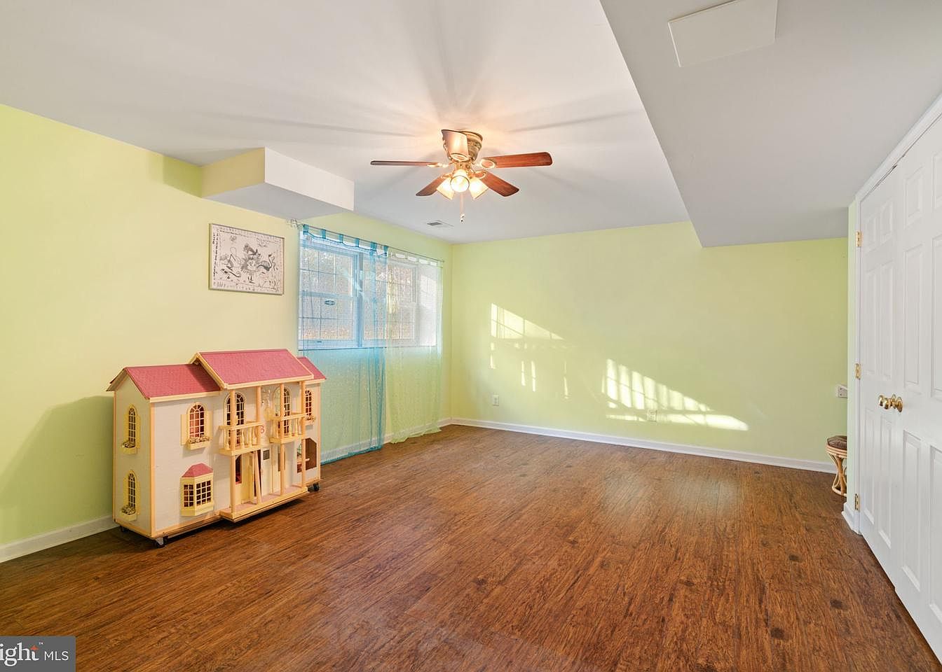 A spacious playroom features soft, pale yellow walls complemented by a warm, wood-like laminate flooring. Natural light filters in through large windows adorned with sheer blue curtains, creating an inviting atmosphere. A large dollhouse in pastel colors stands prominently on the floor, suggesting a child-friendly space. The ceiling fan with wooden blades adds a cozy touch, enhancing airflow while maintaining a relaxed vibe. A small, wooden stool sits near a closet door, promoting functionality. The playful decor and color scheme foster a cheerful ambiance, making it an ideal environment for creativity and play.