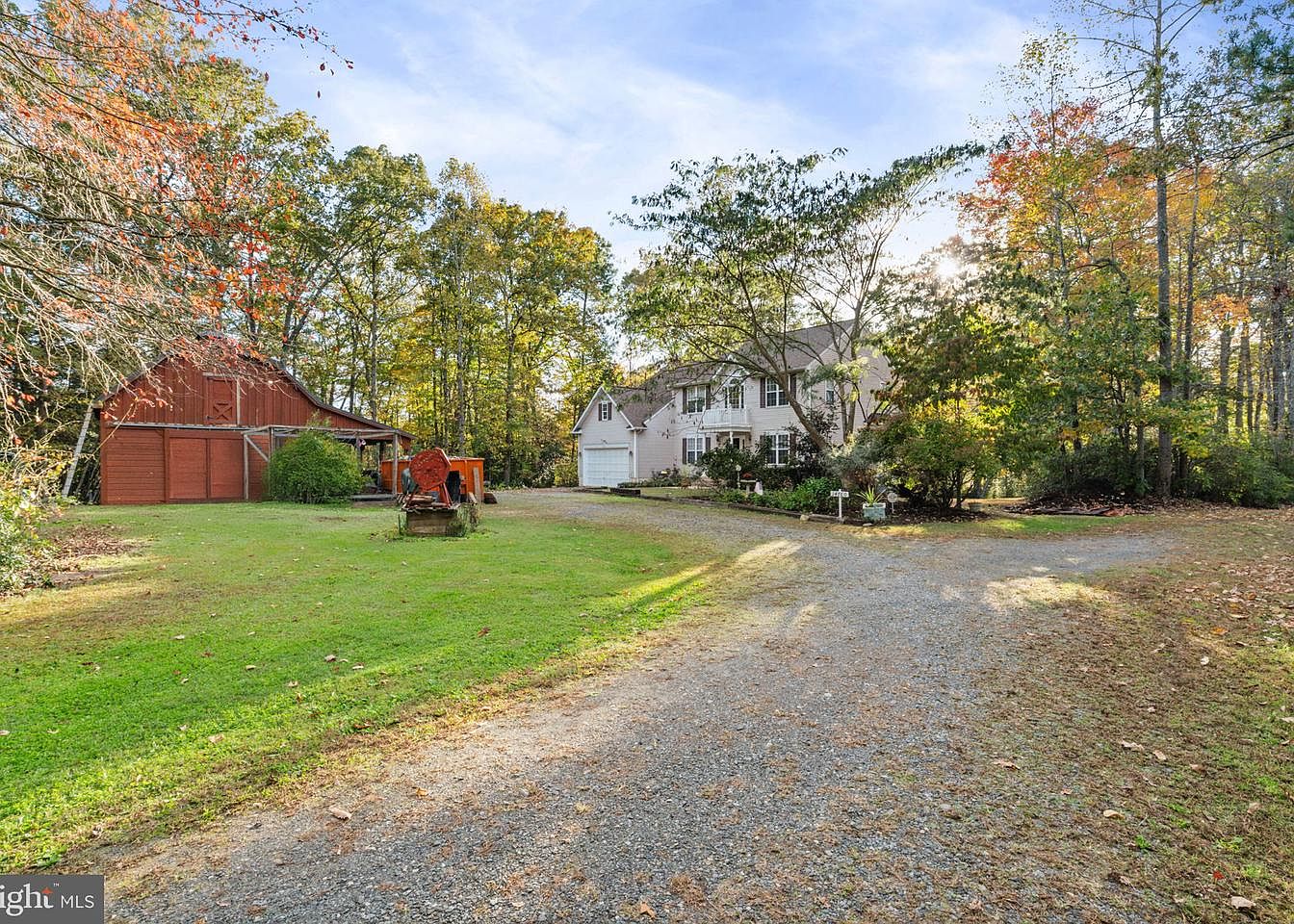 A spacious front yard with lush green grass is framed by a gravel driveway leading toward a charming historic home and a nearby barn. The house, with its inviting facade, features white siding and elegant shutters, complemented by a well-kept garden bursting with colorful flowers. Towering trees, adorned with autumn leaves, provide a natural backdrop, enhancing the serene atmosphere. An old-fashioned piece of machinery sits centrally on the lawn, adding a rustic touch. The gentle curve of the driveway encourages a leisurely approach, inviting visitors to explore this picturesque countryside setting.