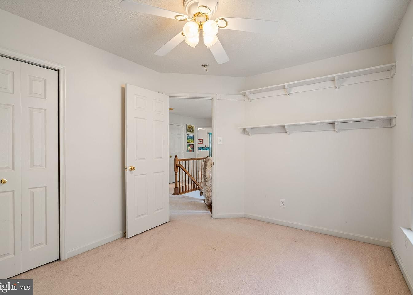 This bedroom features soft, neutral tones with light peach carpeting and light beige walls. A white ceiling fan with five blades provides ventilation. On the left, two bifold closet doors offer ample storage, while the right side displays two white shelving units mounted above the carpeted floor. The room opens to a hallway visible through an adjacent doorway, showcasing wooden railing steps leading to another level. Natural light filters through a nearby window, enhancing the airy feel. The clean lines and minimal decor suggest a serene environment, ideal for relaxation or personalization with furniture.
