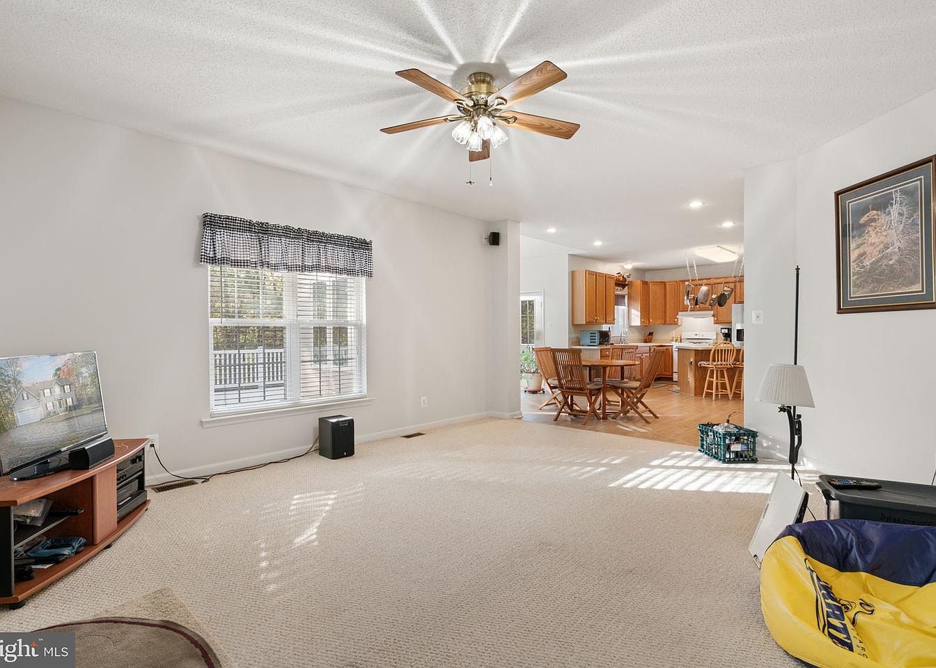 This cozy living room features a light beige carpet that complements the soft white walls, creating an airy atmosphere. Natural light floods in through large windows adorned with checkered valances, enhancing the warmth of the space. A stylish ceiling fan with wooden blades adds a rustic touch. In one corner, a TV stand hosts a flat-screen television, while a comfortable bean bag chair provides casual seating. The room opens seamlessly into a dining area with wooden furniture, hinting at a cohesive design flow. A framed landscape photograph on the wall introduces an element of nature, grounding the decor.