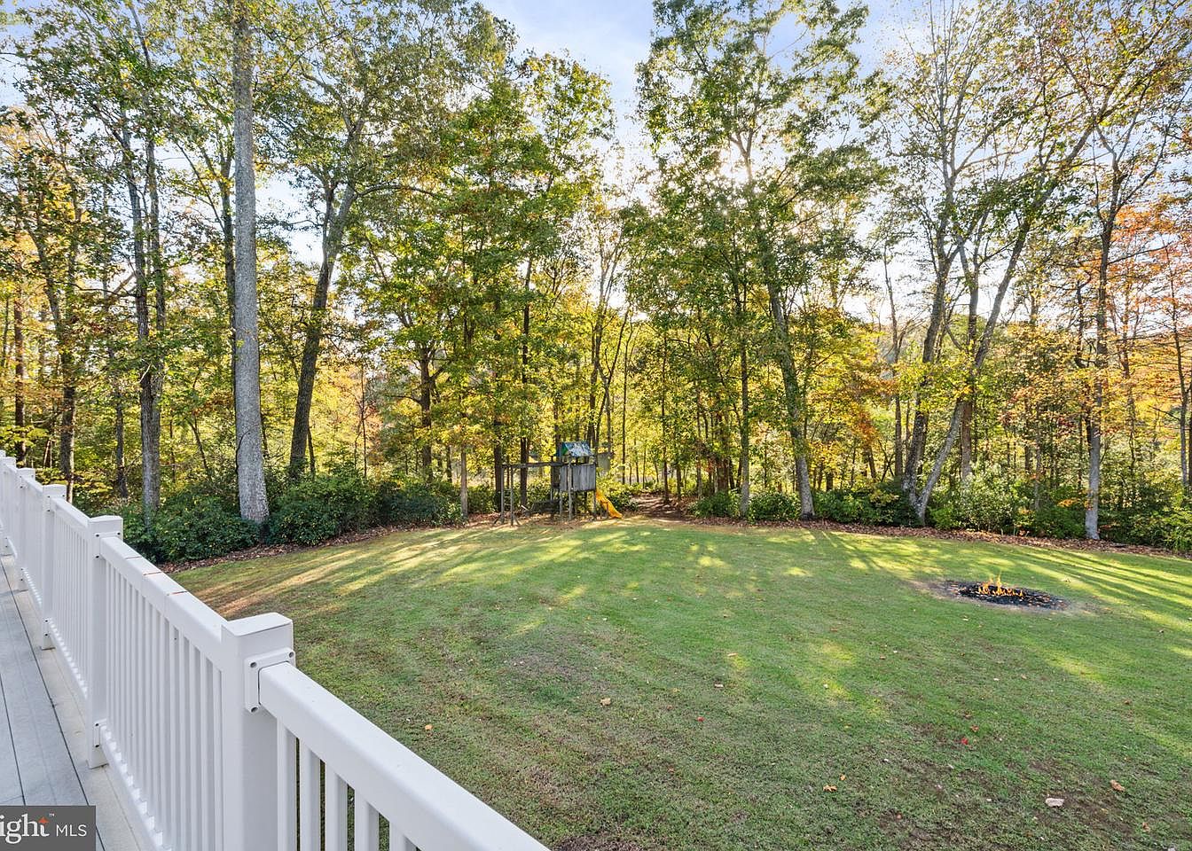 A spacious backyard is revealed, framed by tall trees displaying vibrant fall foliage in shades of green, yellow, and orange. The manicured lawn is lush and appears well-maintained, extending toward the tree line, creating a serene natural backdrop. In the distance, a wooden play structure suggests a family-friendly environment, while a small fire pit is positioned centrally on the grass, inviting gatherings. The white railing in the foreground adds a modern touch contrasting with the rich, natural scenery. Soft sunlight beams through the branches, enhancing the tranquil and welcoming atmosphere of the outdoor space.