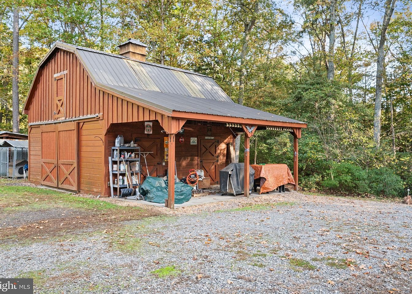 A rustic storage shed displaying a warm, earthy color palette with rich wooden siding and a contrasting metal roof. The structure features a spacious, open area beneath a covered porch, supported by sturdy wooden beams. Various tools and equipment are neatly organized on shelves to the left, emphasizing practicality. The entrance incorporates double doors, enhancing accessibility. Surrounding the shed, a gravel driveway provides a natural look, harmonizing with the lush greenery of towering trees in the background. The balance of utility and rustic charm creates an inviting space conducive to outdoor projects.