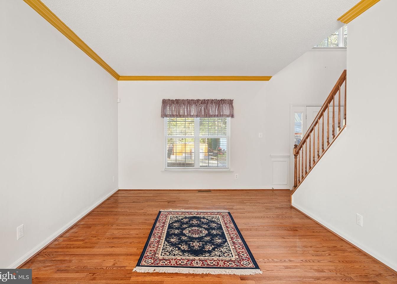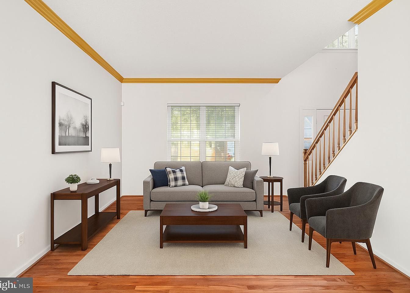 This living room features a warm wooden floor, accentuated by a patterned blue and cream area rug positioned centrally. The walls are painted a soft white, creating a bright and airy atmosphere. A striking yellow crown molding adds a vibrant touch, contrasting with the neutral tones. Natural light floods the space through a large window, adorned with a charming checkered valance, framing views of outdoor greenery. The staircase, finished in rich wood, leads to an upper level, integrating functionality with aesthetics. This room exemplifies a harmonious blend of comfort and classic design, ideal for relaxation and gatherings.