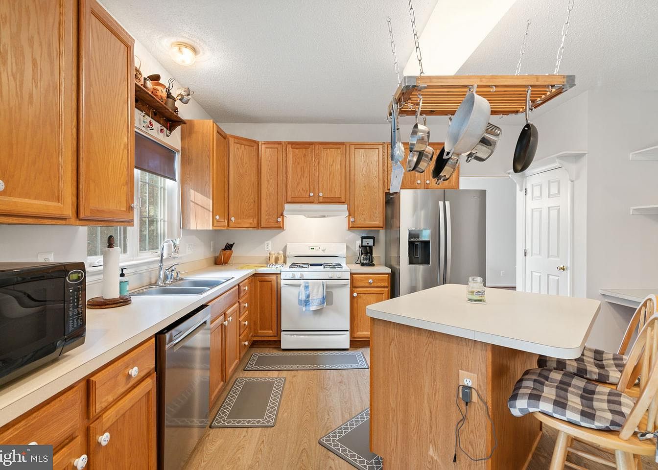 The kitchen features a warm and inviting design with honey-colored wooden cabinets and a clean, white countertop. A modern stainless-steel refrigerator contrasts with the cabinetry. A double sink is positioned under the window, allowing natural light to illuminate the space. Cooking appliances include a white stove and hood, both seamlessly integrated. The area is enhanced by decorative pot racks hanging overhead, showcasing an array of cookware. The flooring is a light wood, contributing to a spacious feel. Area rugs add comfort, while a small breakfast bar with two wooden stools invites casual dining.