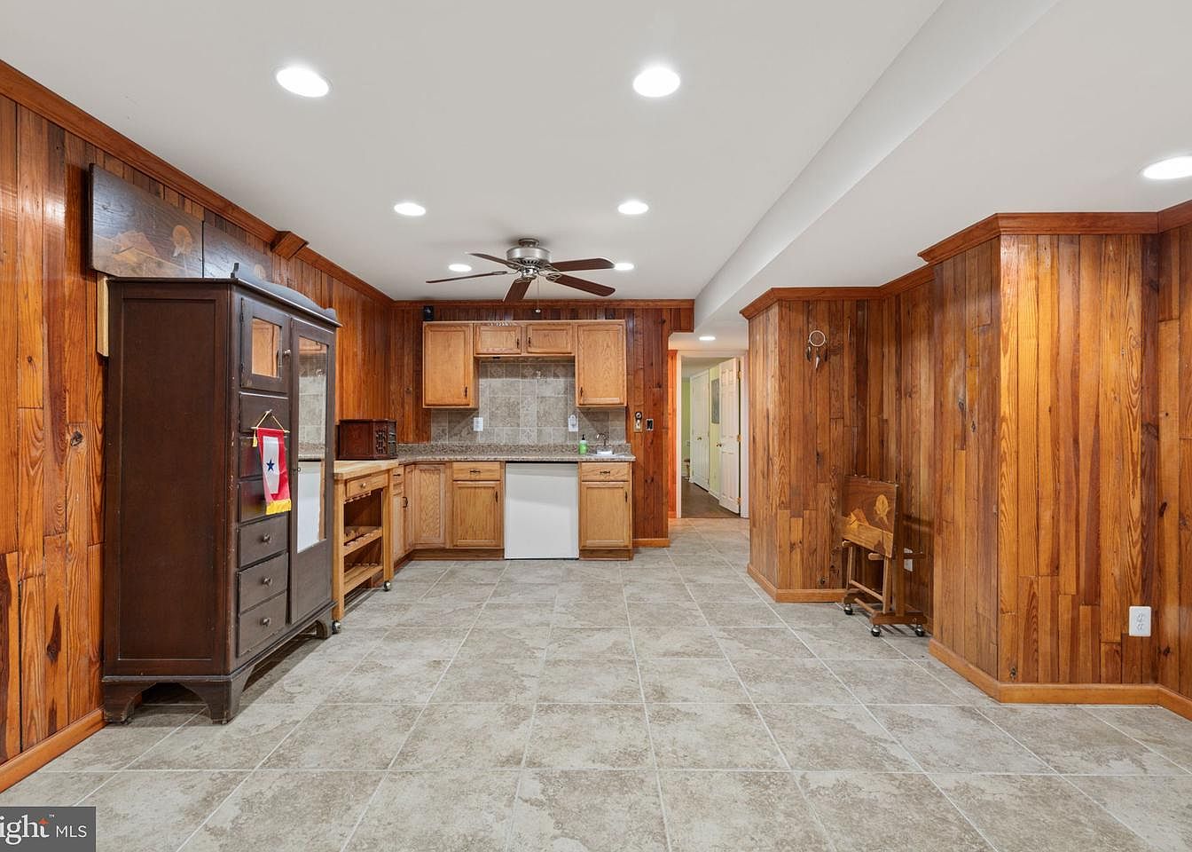A spacious kitchen with a warm, rustic ambiance created by rich wooden paneling and cabinets. The walls are adorned with vertical wood planks, contributing to a cozy, inviting environment. Light-colored, tile flooring offers a nice contrast. The kitchen features a simple yet functional design, with a central island and an antique-style cabinet, complemented by modern amenities like a white dishwasher. Natural light is enhanced by recessed lighting in the ceiling. In the corner, there’s a small folding table, adding versatility to the space while blending seamlessly with the home’s historic charm.