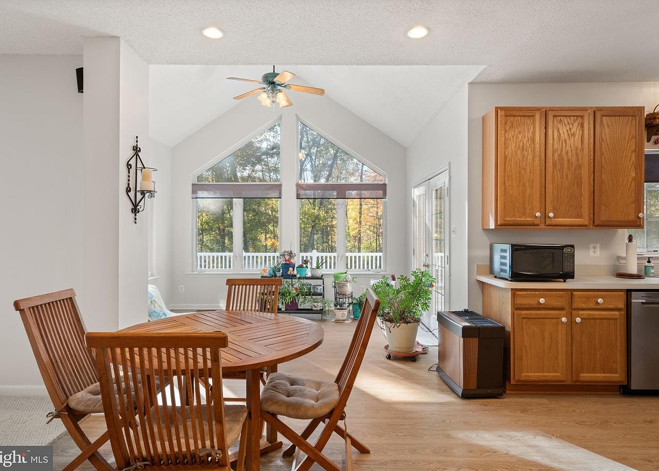 This sunroom features a cozy circular table surrounded by wooden chairs, blending comfort with functionality. Large arched windows dominate the wall, allowing abundant natural light and offering views of the outdoor greenery. A soft neutral color palette complements the light wood tones of the flooring and furniture. The ceiling is high, accentuated by a fan with wooden blades, enhancing the airy ambiance. Potted plants add a touch of life, sitting on the windowsill and near the table. To the side, cabinetry with a microwave and bright countertops maintains the sleek modern aesthetic, perfect for casual dining.