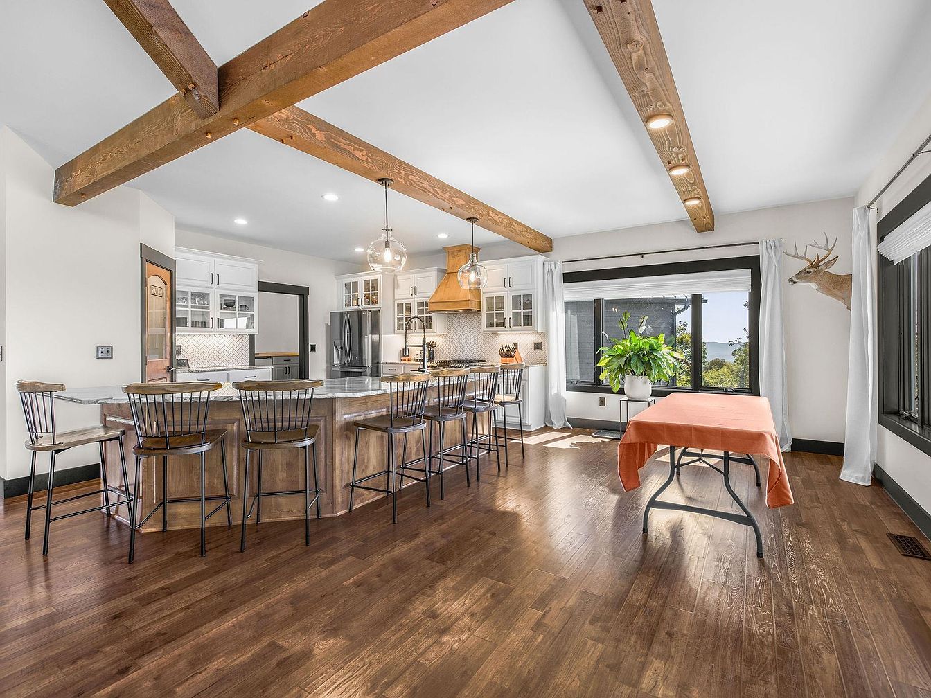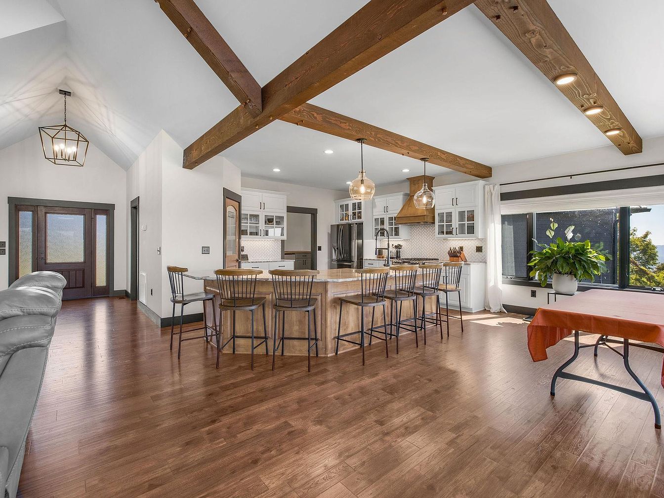 This spacious kitchen features an open layout with high ceilings accentuated by robust wooden beams, blending rustic charm and modern design. The warm, rich tones of the hardwood floors harmonize with the light-colored cabinetry, creating an inviting atmosphere. An expansive island dominates the space, surrounded by sleek metal bar stools for casual dining. Pendant lighting hangs gracefully above, providing a cozy glow. The stainless steel appliances enhance the contemporary feel, while the decorative backsplash adds texture. A large window offers a scenic view, complemented by greenery from a potted plant, bringing a touch of nature indoors.