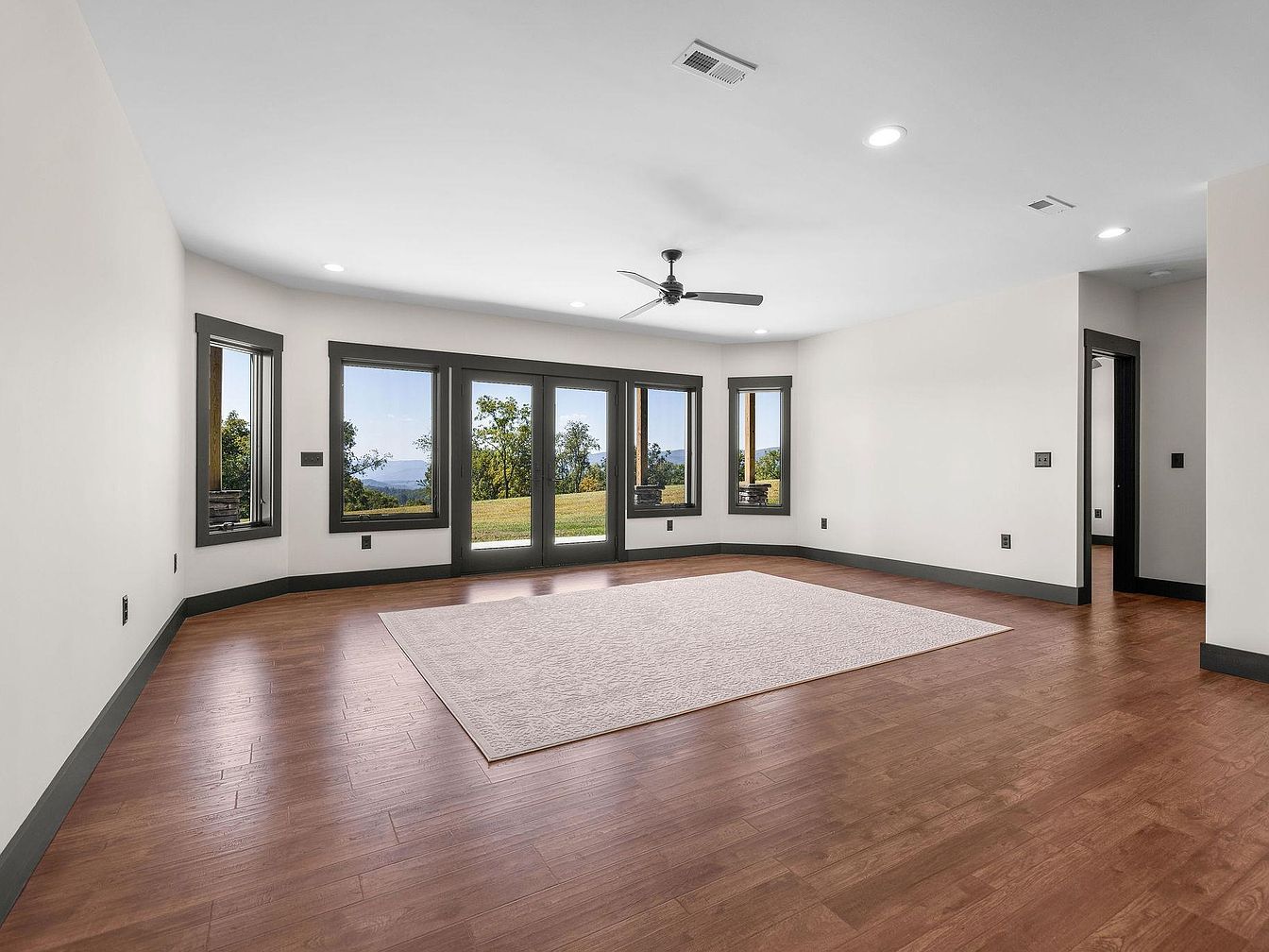 This spacious living room features a harmonious blend of modern and traditional elements. Light pours in through large windows with dark trim, offering a picturesque view of the greenery outside. The hardwood flooring boasts a warm, natural hue, complementing the neutral-toned walls. A subtle area rug lies in the center, inviting comfort and warmth. Modern recessed lighting and a sleek ceiling fan maintain an open, airy atmosphere. Architectural details include a coffered ceiling and well-defined corners, enhancing the room’s sophistication. The layout allows for versatile furniture arrangements while maximizing natural light and outdoor views.