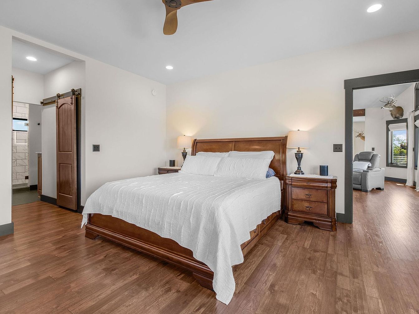 The bedroom features a rich wooden bed frame, lending a classic touch to the space. A crisp white quilt covers the mattress, providing a fresh contrast against the warm wood tones. Flanking the bed are two nightstands, each adorned with stylish lamps that emit a soft glow. The flooring is a polished wood, enhancing the room’s coziness. A sliding barn door leads to a bathroom area, marked by its clean lines and minimalistic style. Large windows offer a glimpse of outdoor views and fill the room with natural light, accentuating the neutral color palette and creating a serene ambiance.