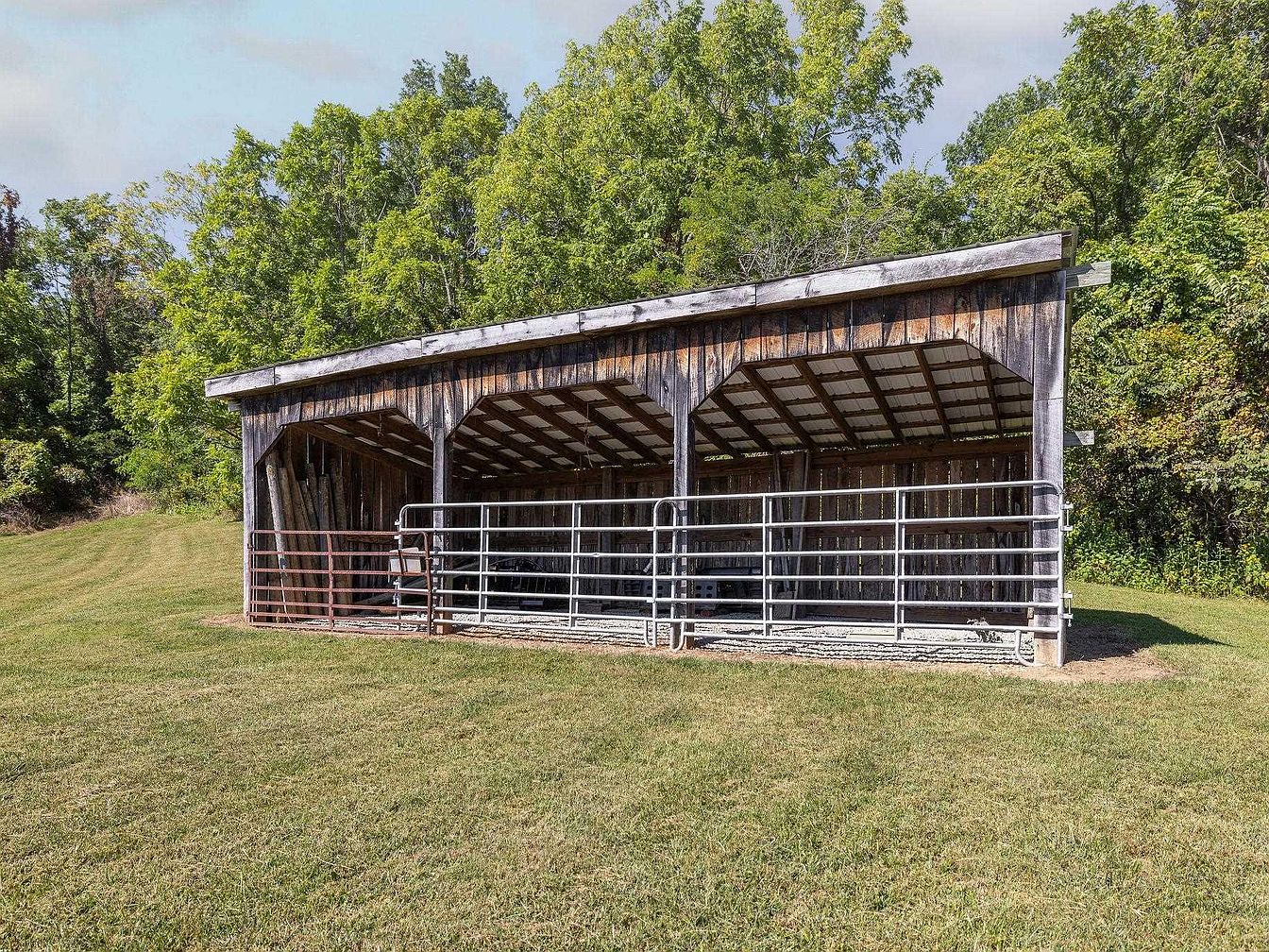 This structure is a rustic horse shelter featuring a wooden frame with a slanted roof. Its weathered wood finish showcases a blend of browns and grays, offering a natural, earthy aesthetic. The open design includes two spacious compartments, each protected by metallic railings, inviting airflow and visibility. The roof is supported by a series of exposed wooden beams, providing a sturdy yet simplistic appearance. Surrounding the shelter is a well-maintained grassy area, enhancing the pastoral setting. Lush trees in the background add a vibrant green backdrop, complementing the shelter’s rustic charm.