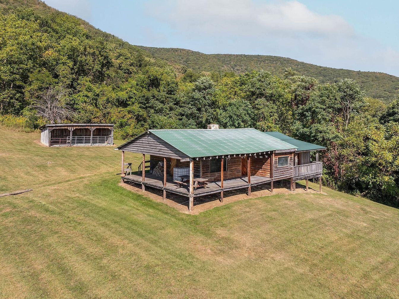 A rustic, single-story log cabin features a broad green metal roof and wooden siding. Set against rolling hills, the cabin nestles in a vibrant landscape. The expansive deck provides a welcoming outdoor area, embraced by wooden railings and ample space for seating. Adjacent to the cabin, a smaller structure, possibly a shed, complements the rustic charm with its simple design. Lush greenery surrounds the property, enhancing the natural ambiance. The grassy lawn subtly slopes, creating a serene backdrop for the home, whilst the overall aesthetic radiates a tranquil country retreat, harmonizing with its picturesque rural setting.