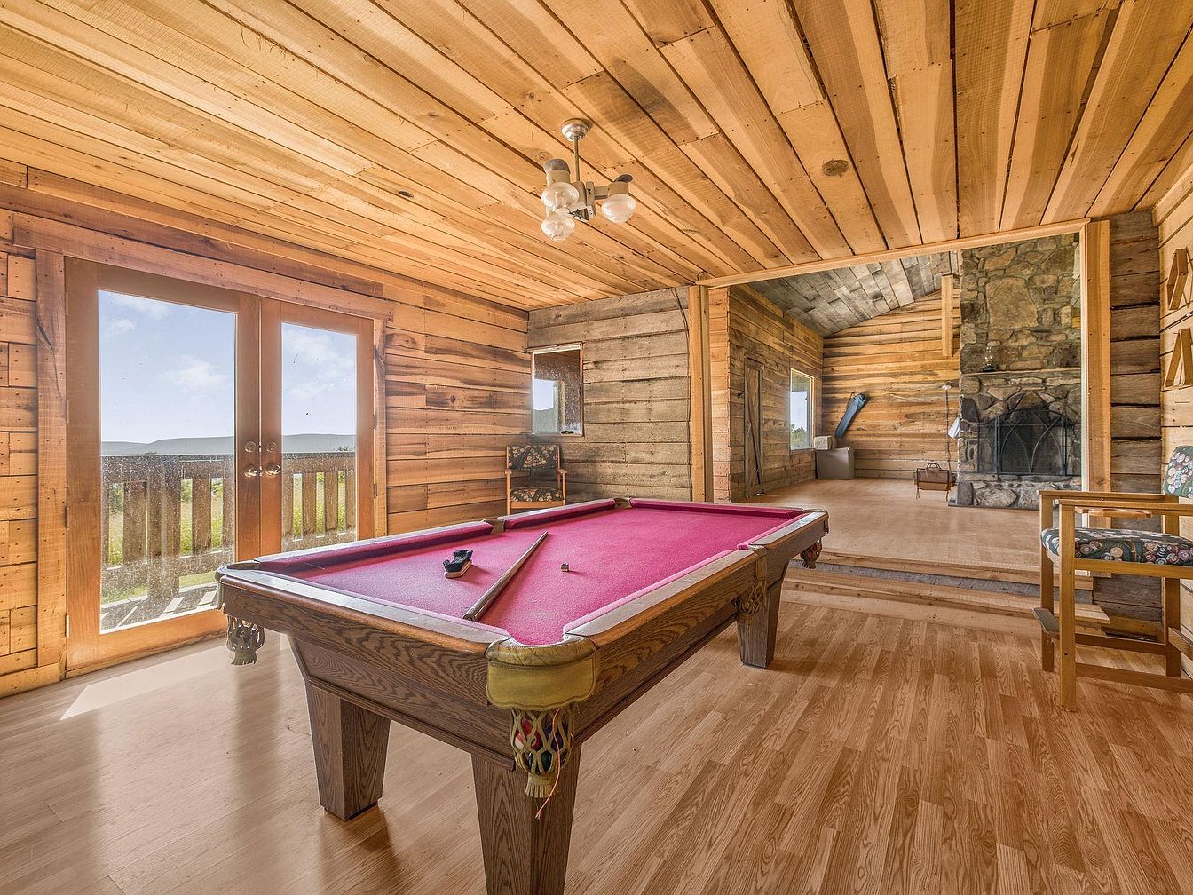 This inviting game room features a prominent billiards table with a striking pink felt surface, positioned centrally in the space. The rustic wooden walls, crafted from planks, exude warmth alongside a matching ceiling. Natural light floods in through double French doors, which open to scenic views, enhancing the spacious feel. To the right, a stone fireplace stands as a cozy focal point, flanked by two windows that invite additional sunlight. A vintage chair with floral upholstery adds a touch of character, while a wooden floor complements the overall warm, cabin-like aesthetic, creating an inviting area for relaxation and entertainment.