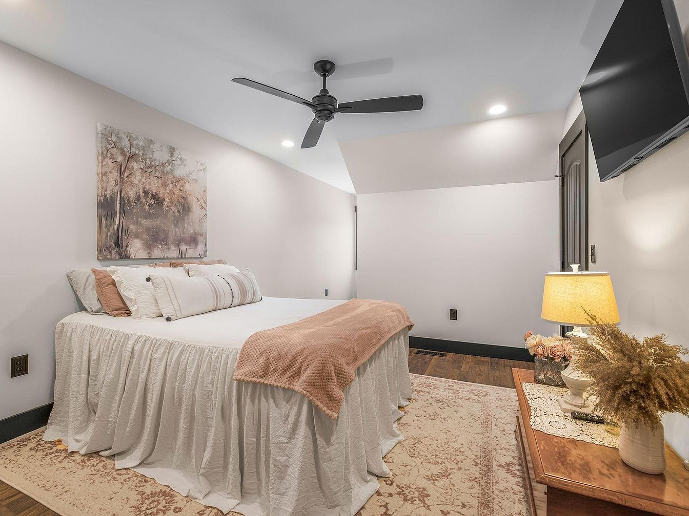 A serene bedroom showcases a cozy ambiance with soft, muted colors. The centerpiece is a bed dressed in a pristine white skirt and plush pillows in pastel shades of pink and cream. An elegant artwork of a tranquil landscape hangs above, complementing the room’s calm aesthetic. A stylish ceiling fan offers a practical yet modern touch. To the side, a side table features a soft-lit lamp, while a vase with dried flowers adds a natural element. The warm wood flooring contrasts beautifully with the light walls, enhancing the inviting feel of the space and promoting relaxation.