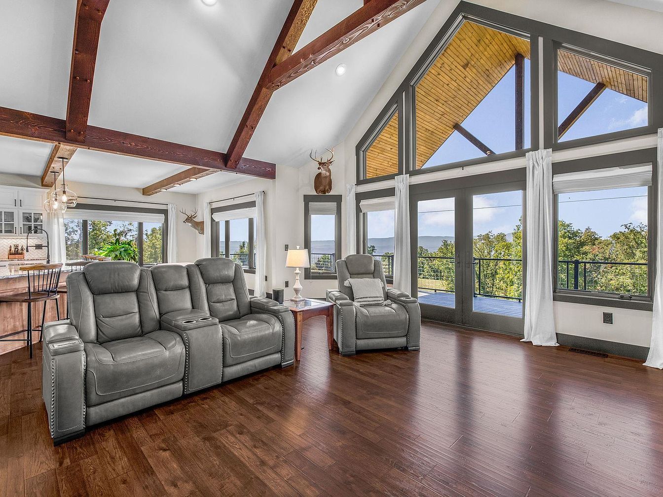 The spacious living room features high vaulted ceilings adorned with exposed wooden beams, creating an airy atmosphere. Large floor-to-ceiling windows offer stunning views and allow natural light to flood the space. Grey leather reclining sofas provide comfort, positioned for relaxation with a subtle coffee table in between. The warm wood flooring complements the contemporary design, while light-colored drapes soften the natural light and add elegance. A charming accent chair enhances the seating area, and the nearby kitchenette with bar seating showcases wooden cabinetry, merging functionality with style. The overall aesthetic is modern yet cozy, perfect for gatherings.