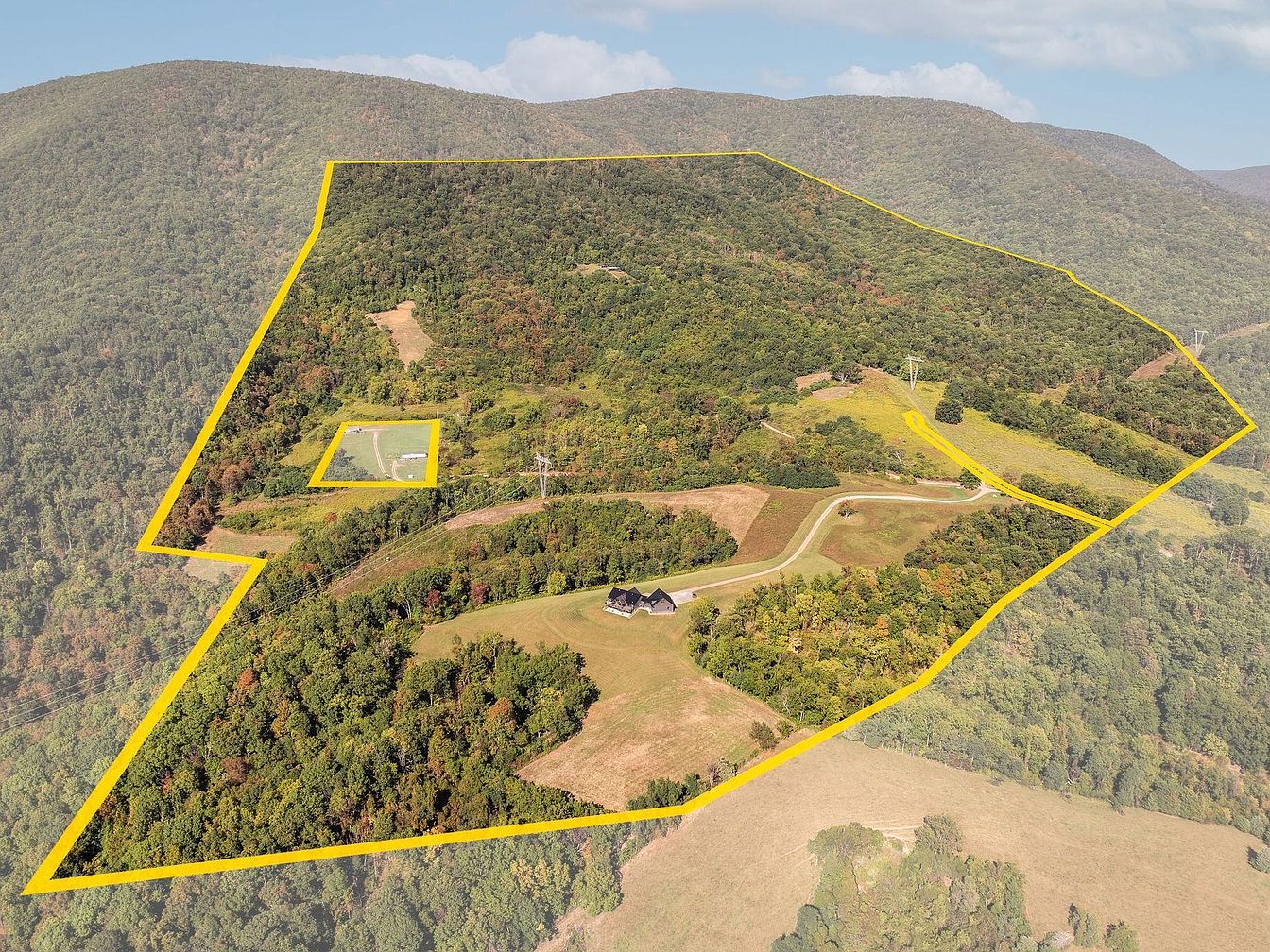 Aerial view showcases a sprawling property bordered by yellow lines that define its expansive boundaries. The landscape features a mix of dense woodland and open fields, with the vibrant autumn foliage visible in response to the changing seasons. A winding road meanders through the area, leading to the main house, which appears nestled amidst the greenery. The architecture reflects a classic American style, with a dark roof contrasting against the lighter shades of the surrounding landscape. Nearby, smaller outbuildings are situated on a clearing, enhancing the rural charm and tranquil ambiance of this picturesque setting.