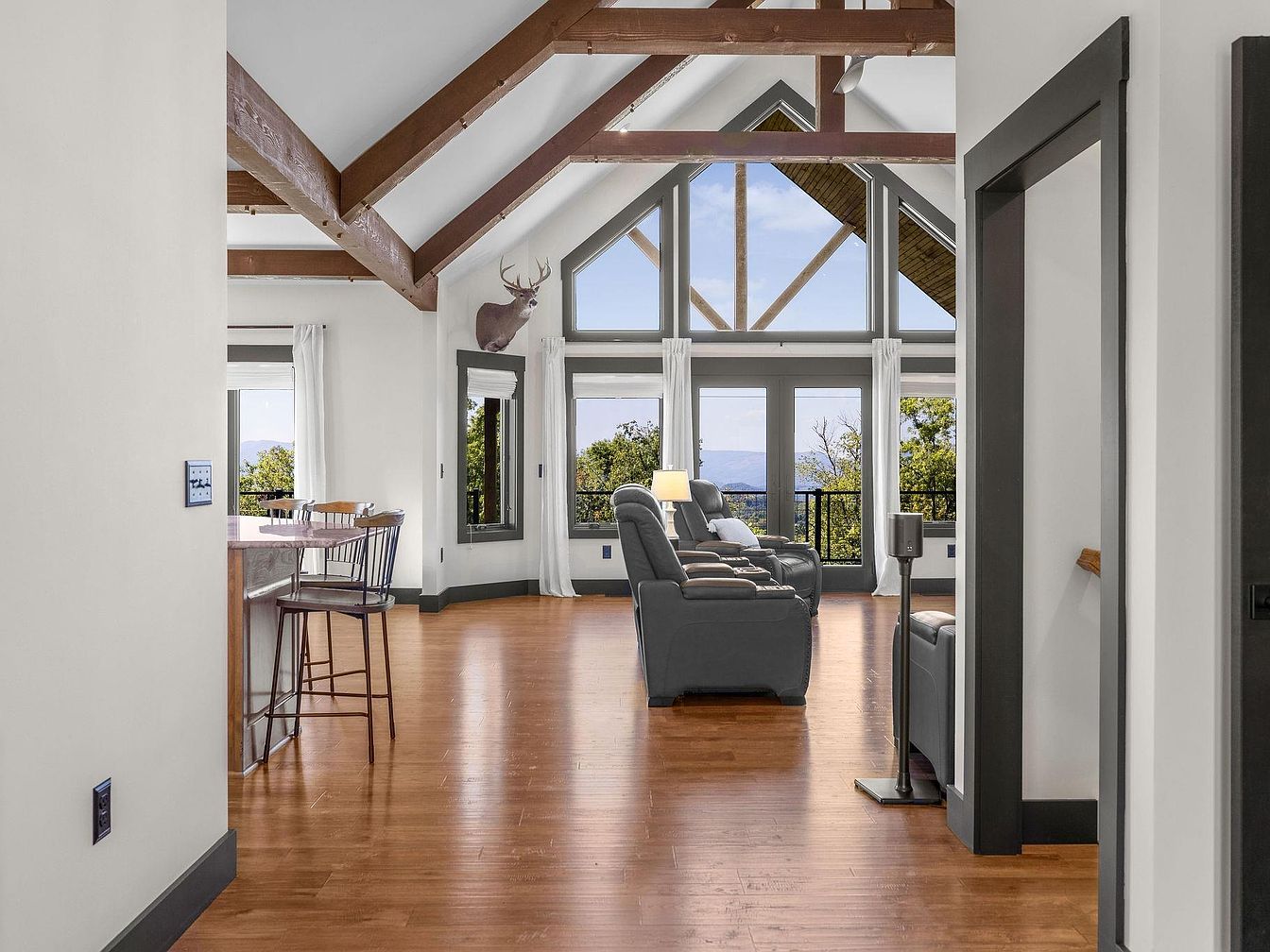 A spacious living room showcases wooden beams across the high ceiling, creating a rustic yet modern aesthetic. Large windows flood the area with natural light, offering breathtaking views of the outdoors. The color scheme features soft, neutral walls contrasting against the dark trim, emphasizing the warmth of the hardwood floor. Comfortable, dark gray recliners with plush cushions invite relaxation, while a stylish standing lamp provides soft illumination. A small dining area with wooden chairs and a bar top subtly integrates functionality into the space, making it ideal for gatherings. Overall, the room exudes a cozy, inviting atmosphere.