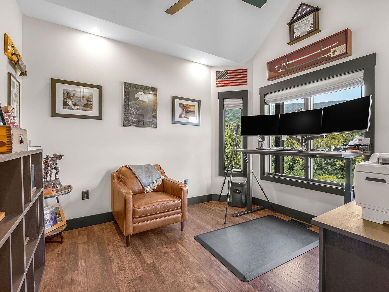 This home office features a blend of modern and rustic aesthetics. Natural light pours in through large windows framed in dark wood, enhancing the warm tones of the hardwood floor. A sleek, standing desk holds three monitors, creating a functional workspace. A cozy brown leather armchair is positioned nearby, adorned with a light throw, inviting relaxation. The walls display framed photographs and an American flag, adding a touch of personality. Architectural elements include a high ceiling with subtle recessed lighting. A small bookshelf houses decorative items and personal mementos, enriching the space with character and warmth.