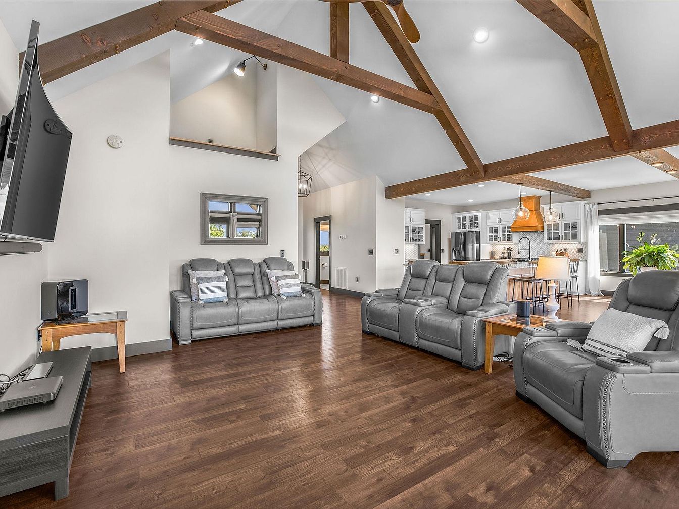 A spacious living room featuring a high ceiling framed with exposed wooden beams, emphasizing a rustic yet modern aesthetic. The walls are painted in a soft white, enhancing natural light. Grey leather recliners invite relaxation, complemented by decorative throw pillows. A sleek wooden console holds a flat-screen TV and a small speaker, while a mirrored wall decor adds depth. The rich, dark wood flooring contrasts elegantly with the light-colored furniture. In the background, a glimpse of the kitchen reveals a contemporary setup with white cabinetry and a stylish pendant light. Overall, the space conveys comfort and contemporary charm.