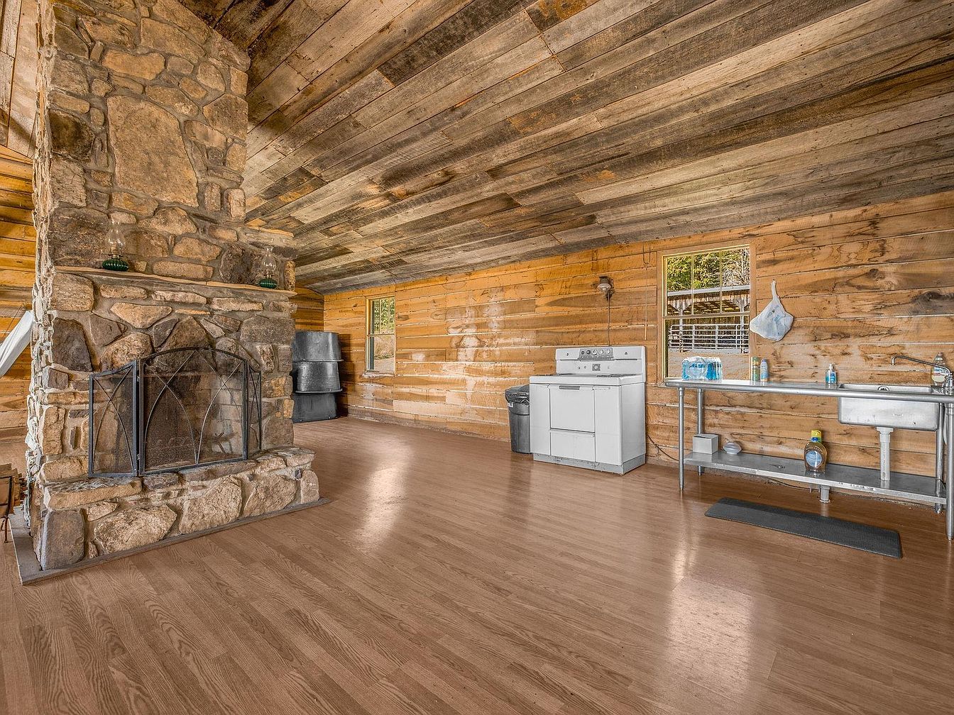 This spacious kitchen area features a rustic charm with wooden walls and a ceiling made from reclaimed wood, contributing to a warm, cozy atmosphere. A prominent stone fireplace with a metal screen stands as a focal point, adding character. The flooring is smooth and light-colored, enhancing the openness. A white vintage-style stove is positioned against a backdrop of natural wood, while a stainless steel work table with a sink sits nearby, offering functionality. Large windows allow natural light to permeate, illuminating the space and showcasing the simplicity and practicality inherent in this historic kitchen design.