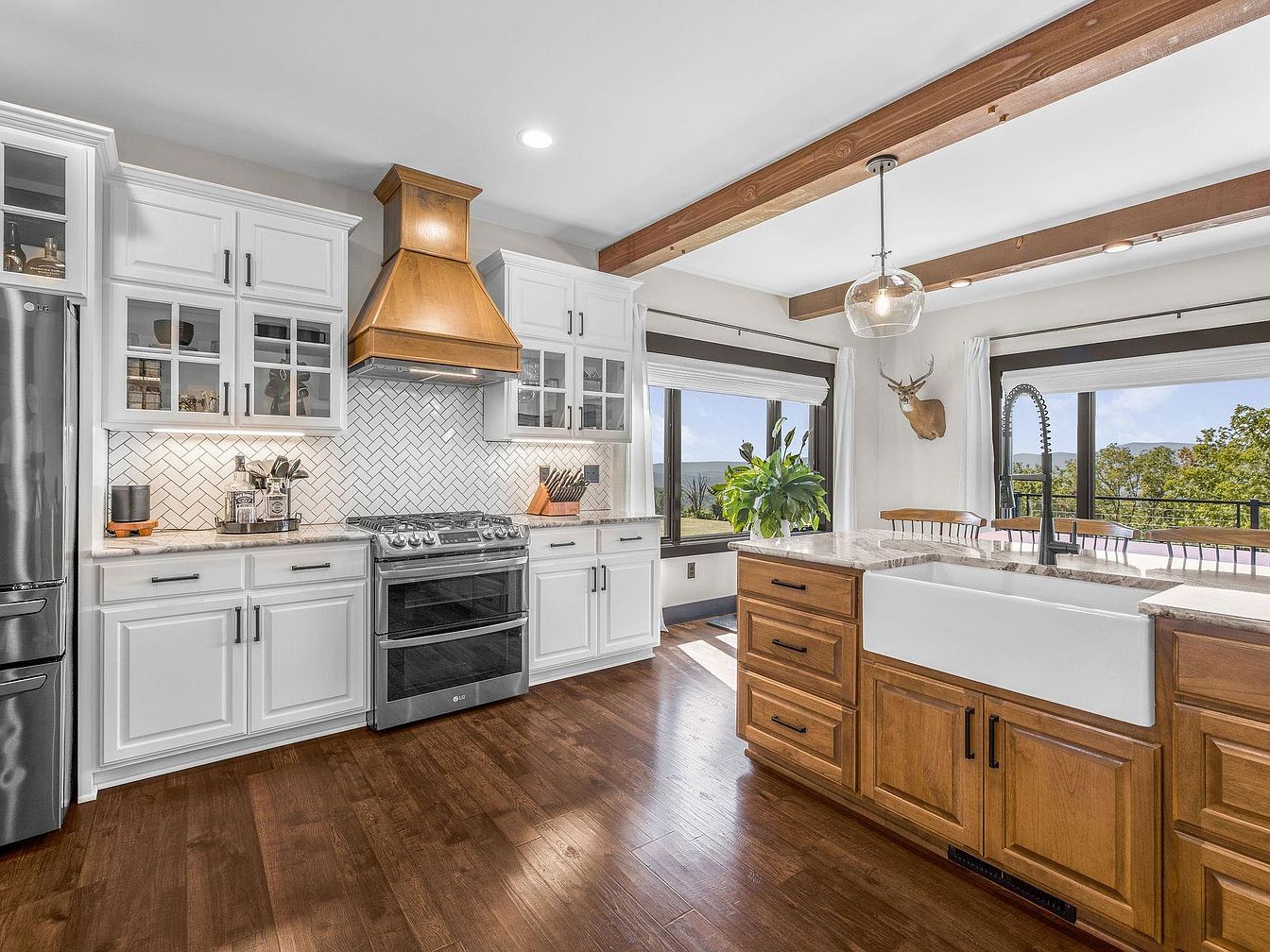 This modern kitchen features a blend of classic and contemporary design elements. The white cabinetry showcases glass-paneled doors, allowing for decorative display. A distinctive copper range hood above the stainless steel stove adds a warm focal point. Herringbone-patterned white tiles create texture between countertops, which combine light shades and natural wood grain. An inviting farmhouse sink resides in a large island, accented by dark hardware that complements the rich wooden floor. Ample natural light pours in from expansive windows framed by soft, white curtains, casting a welcoming glow and offering stunning outdoor views, enhancing the kitchen’s overall appeal.