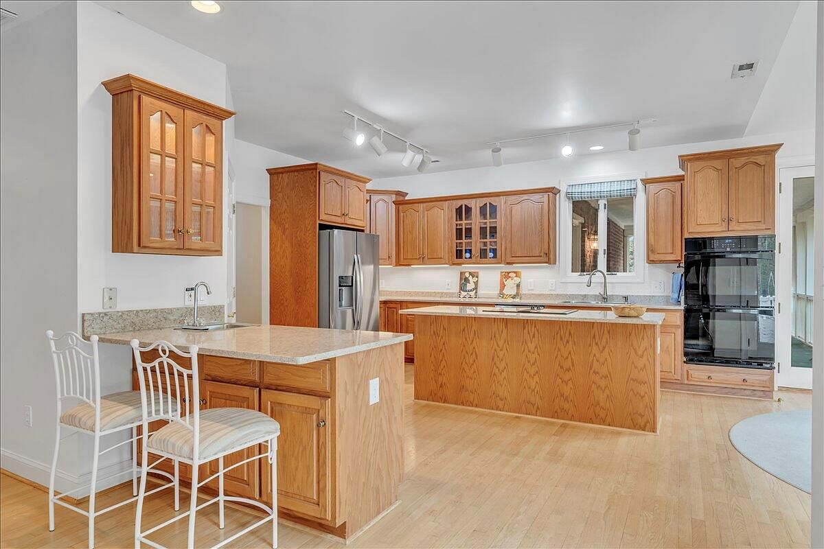 This kitchen features a spacious layout characterized by honey-colored oak cabinetry and a large central island with a light granite countertop. Natural light floods the area through expansive bay windows adorned with plaid valances, creating a bright and inviting atmosphere. The flooring is polished hardwood, enhancing the warmth of the space. To one side, a cozy dining area is set with a circular table and metal-framed chairs, perfect for casual meals. Modern appliances are seamlessly integrated, ensuring functionality without compromising the aesthetic. Overall, the design harmonizes traditional elements with a contemporary feel.